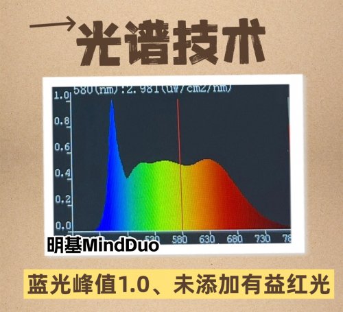 明基MindDuo的光谱表现相对常规,实测蓝光峰值高达1.0,已接近安全临界值,且缺乏红光增益设计。其光谱曲线虽然没有无明显断层,但在415-455nm有害蓝光波段有明显尖峰,长期使用会加重视网膜负担,视觉疲劳的风险更高。它仅能满足“不直接伤眼”的基础安全标准,无法实现深层护眼与养护,孩子长时间使用后易出现眼干、视物模糊的症状。