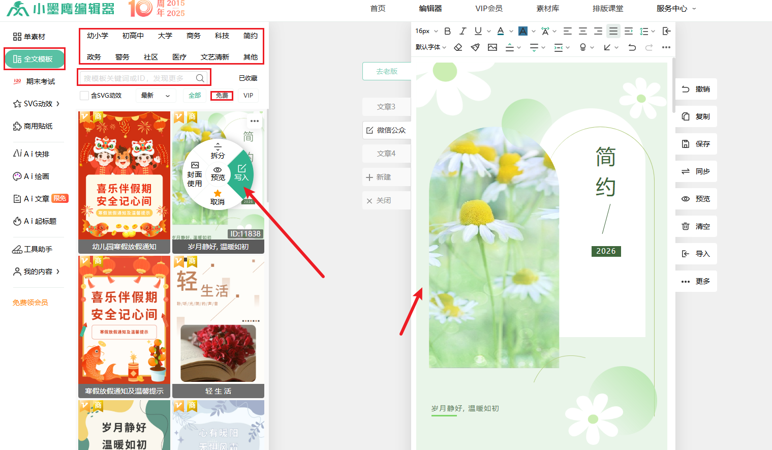 这是最快出效果的招儿!左边栏找到 “全文模板”,根据你的文章风格 —— 不管是简约风、文艺风还是卡通风,挑一个你顺眼的点进去。模板会自动帮你把字体、颜色、行间距都调好,瞬间就有专业那味儿了。