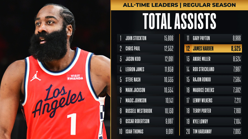 本场送出10次助攻后,哈登生涯助攻数来到8529次,成功超越安德烈-米勒升至历史第12位,加里佩顿8966次排在第11名。
