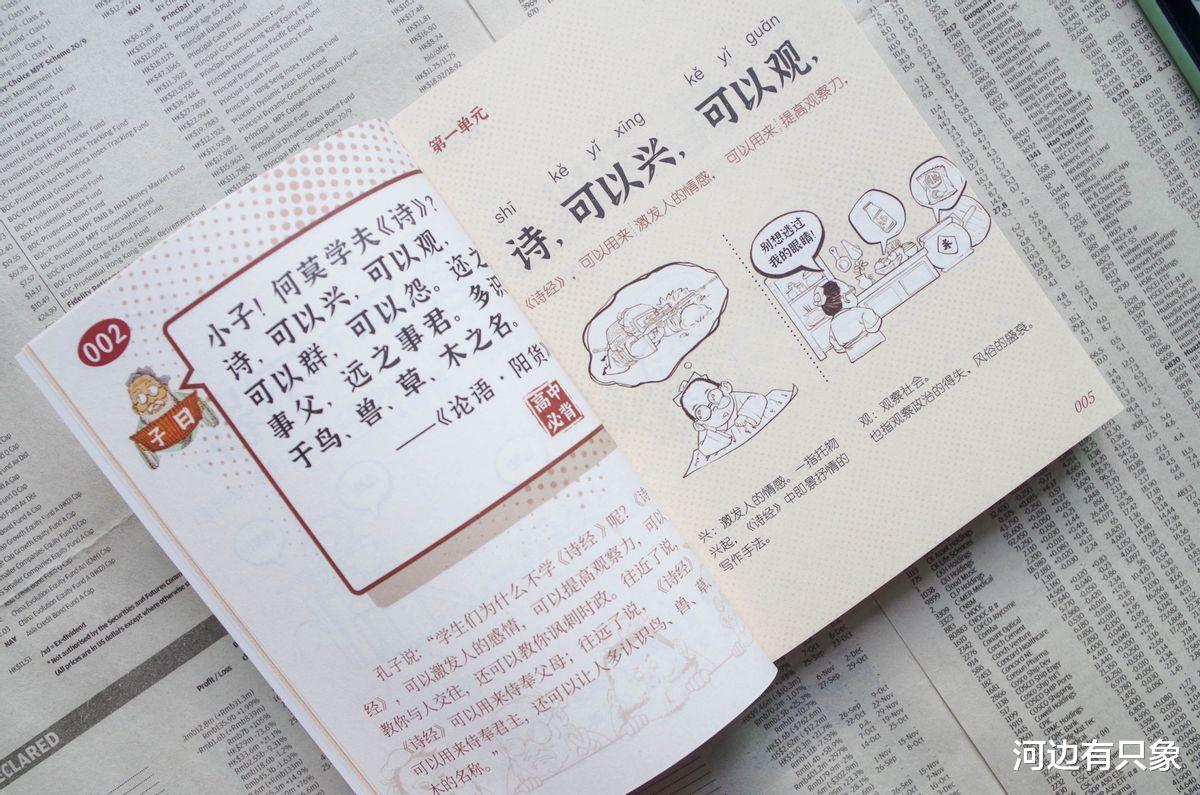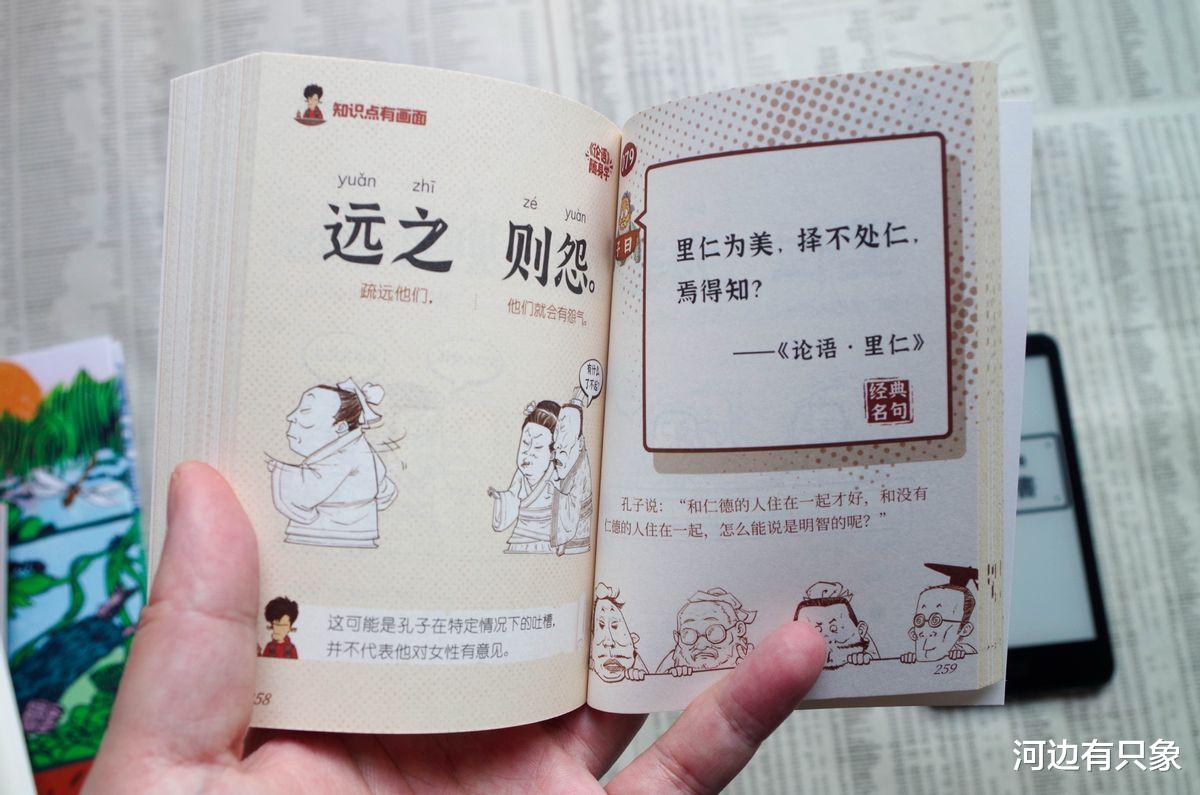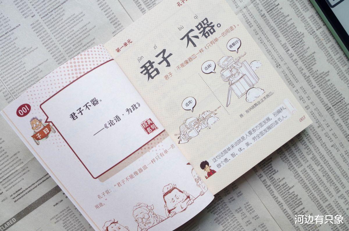 首先是原文,然后下方有翻译,告诉大家这句话是什么意思;然后第二页则是带句读、拼音和解读的详细解读;还有用生活小故事趣味演绎的漫画,让读者轻轻松松理解论语的大道理,可以说《论语》是一点也不枯燥。