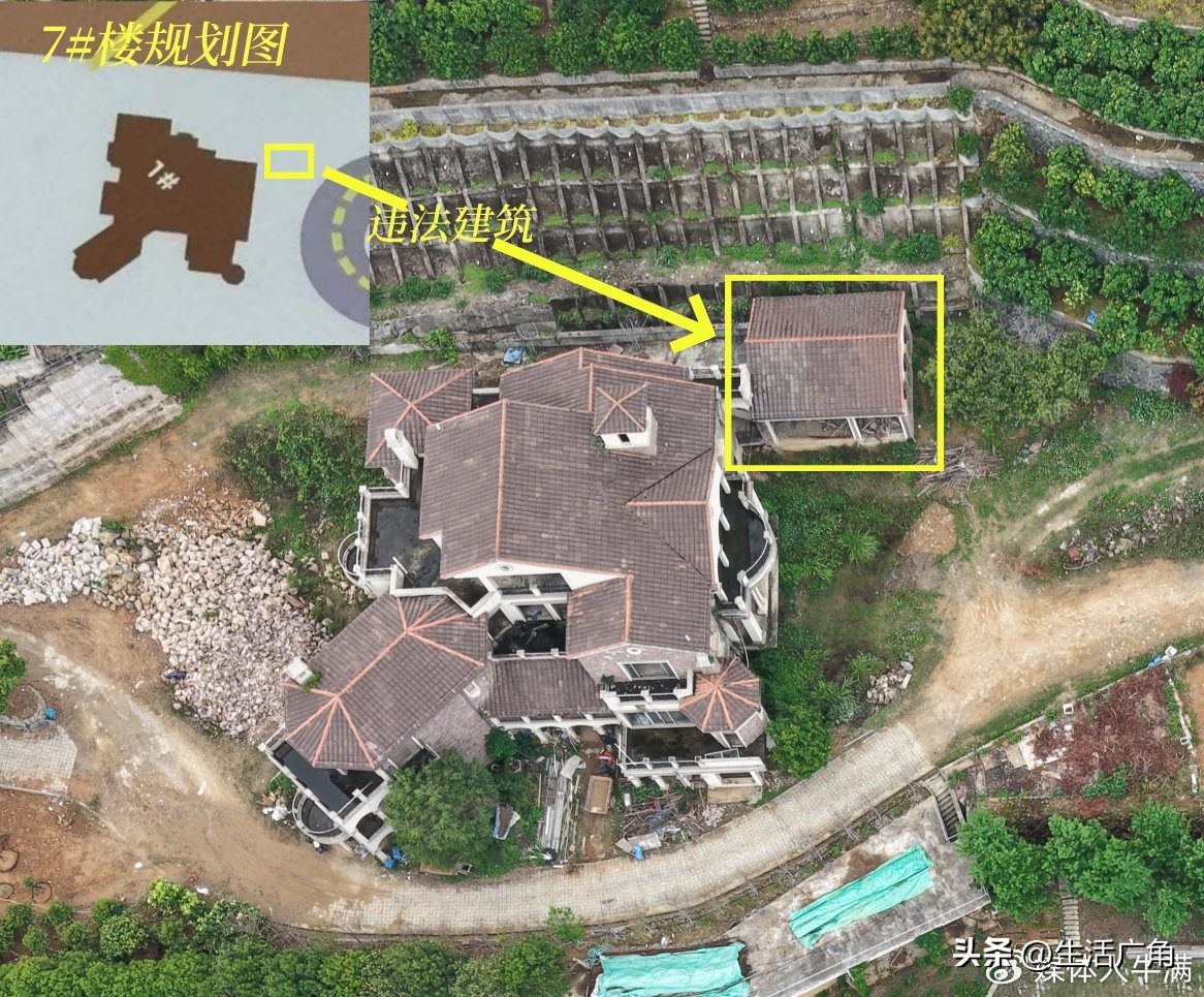 据称,6#—2和7#两栋楼为同一业主。但走近一看,7#楼左侧明显违建。
