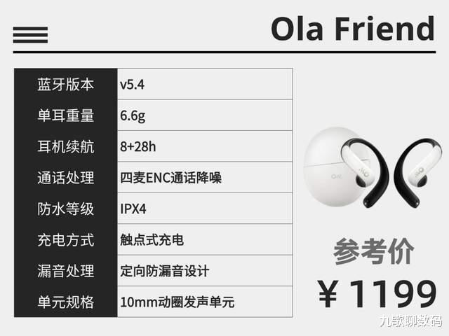Ola这款耳机单耳仅6.6g,很轻,戴在耳朵上没什么负担,而且用的是医疗级液态硅胶材质,兼顾了安全性和佩戴舒适度;音质方面虽然配备了动态EQ和动态低音补偿技术,但声音细节表现不算突出,整体效果比较一般;它支持双设备同时连接,日常切换使用很方便;总续航能达到28小时,能满足日常用电需求,不过综合来看性价比不算高。