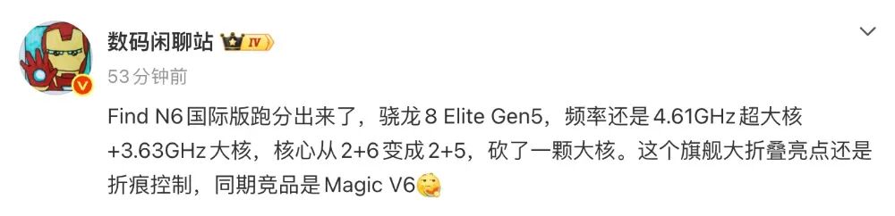 而对于这款新机,据数码博主“数码闲聊站”爆料称,来自OPPO Find N6新机。该机搭载的这款处理器仍为骁龙8 Elite Gen5,“频率还是4.61GHz超大核+3.63GHz大核,核心从2+6变成2+5,砍了一颗大核。这个旗舰大折叠亮点还是折痕控制,同期竞品是Magic V6”。有业内人士分析,折叠屏手机受限于机身厚度和散热空间,“少一核换功耗与温控余量”的思路比单纯堆核更务实,这也不是OPPO第一次采用类似策略——去年的Find N5就有过先例。