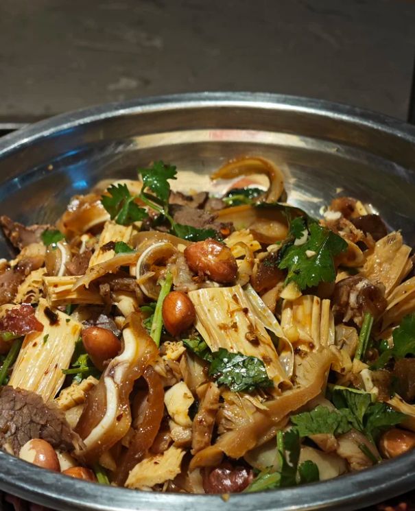 接下来的魔法,在于那一勺滚烫的卤汁,以及随后的“拌”。老板会问:“要好辣?”根据回答,浇上不同分量的辣椒油,再撒上香菜、花生碎、萝卜丁。然后手持钵沿,上下颠簸、左右摇晃,让每一块食材都均匀地裹上那深褐色的、香气扑鼻的卤汁与红亮的辣油。整个过程充满节奏感,是视觉与嗅觉的双重享受。