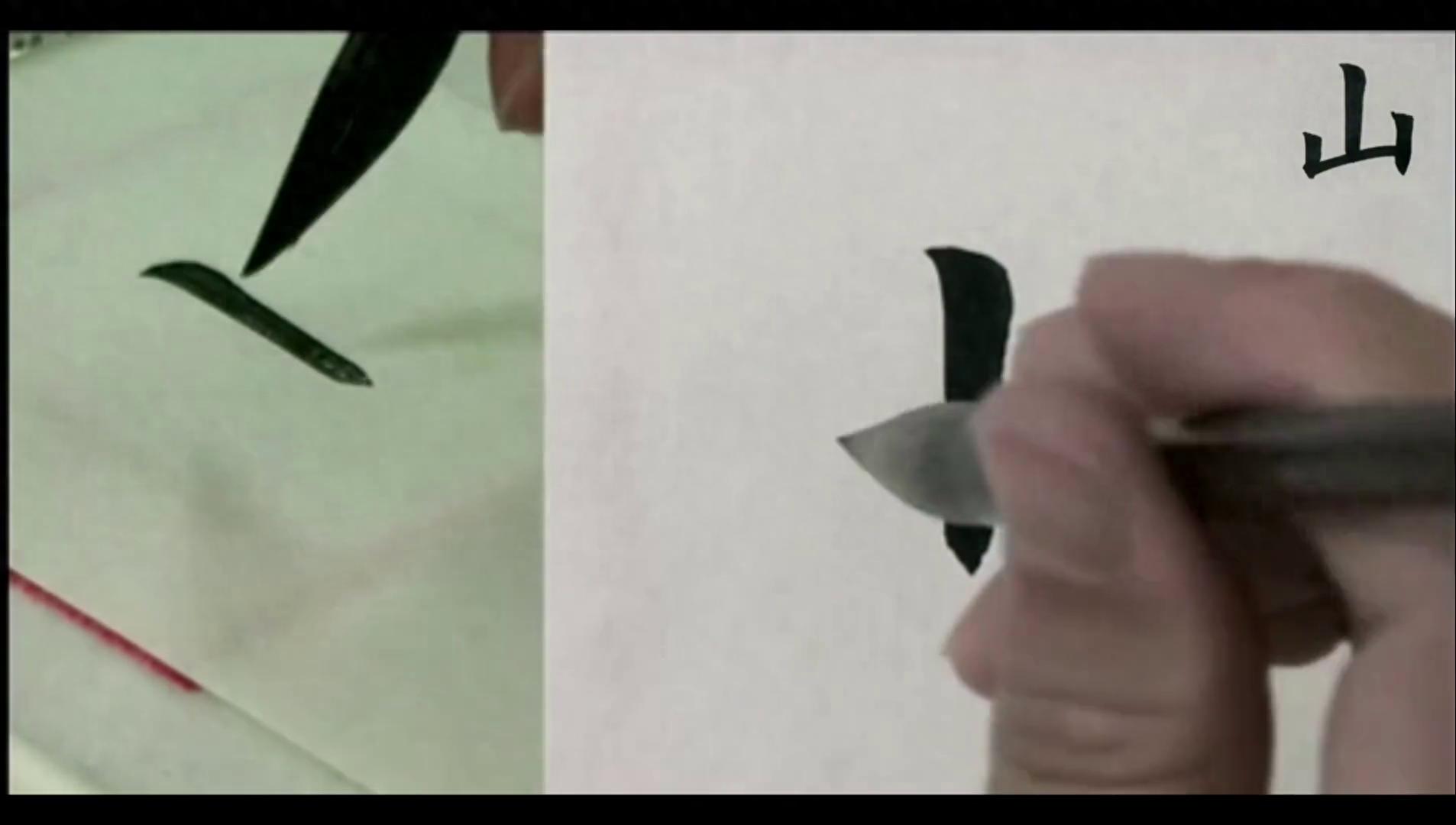 山,山起笔比较平一点,转正,移下来,收笔。左边下来一般会突出一点点,因为转折的关系。横画变细,有点弧度。右边的三又稍微长一点点,加点粗细。把重心压回来,因为斜上去的,要靠这个来压回来。
