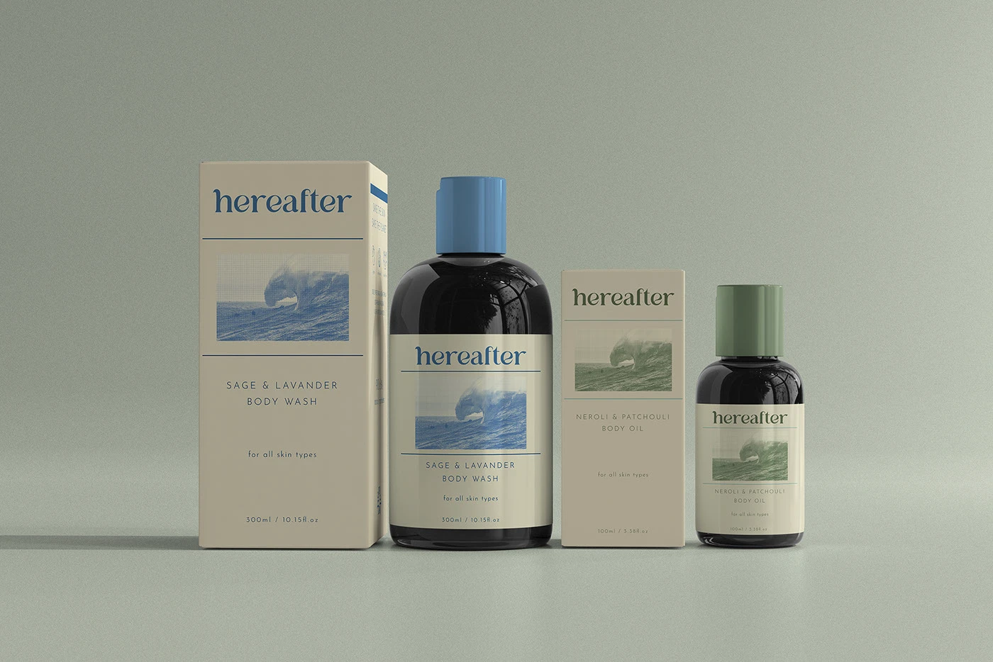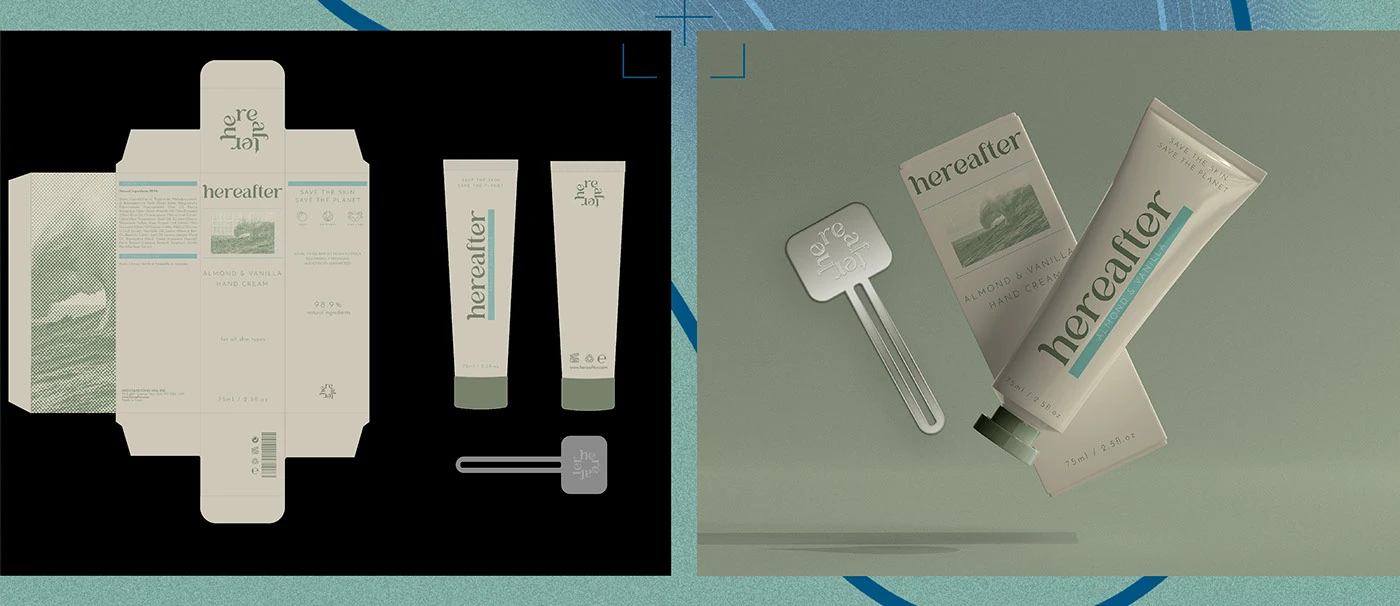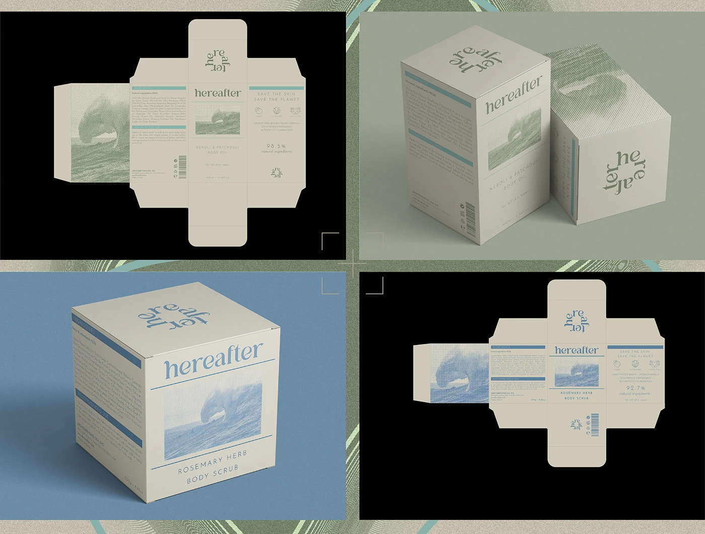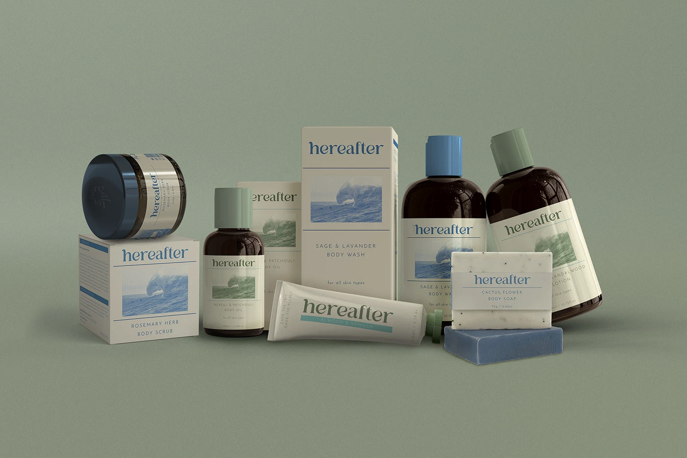Hereafter的包装设计走的是简约自然路线。整体以大地色系为主,搭配清新的蓝绿色调,给人一种质朴、环保的感觉。