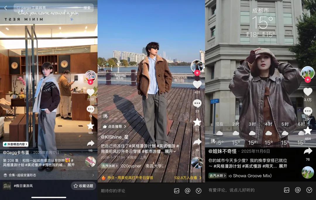 抖音时尚近期推出的「风格漫游计划」正是沿着这个逻辑展开。平台通过 #都市游猎风、#英伦学院风、#假日漫游风 三个话题,全面覆盖到了都市通勤、校园日常和户外出游这三类高度日常、又最容易产生穿搭需求的生活场景。
