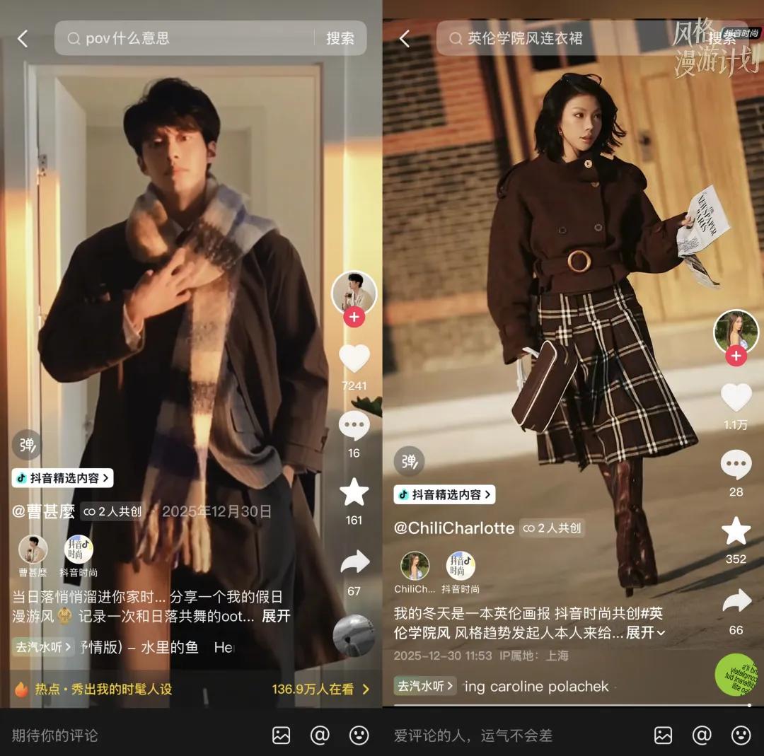 与此同时,抖音聚集了大量对时尚有见解的创作者。他们将自己的穿搭融入具体生活场景:出门喝咖啡怎么穿,周末郊游怎么搭,一件基础款怎么通过配饰点睛……这些内容吸引着品味相近的用户,在点赞、收藏和模仿中,逐渐形成了默契的审美倾向。