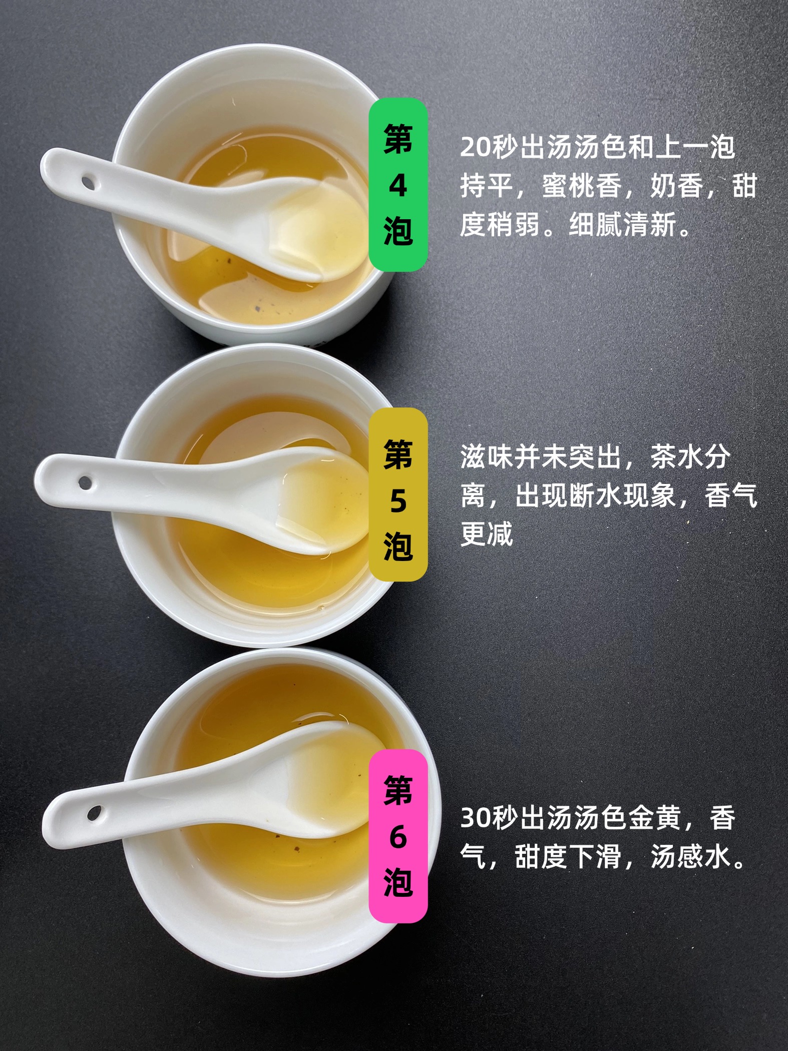 第四泡,20秒出汤汤色和上一泡持平,蜜桃香,奶香,甜度稍弱。细腻清新。