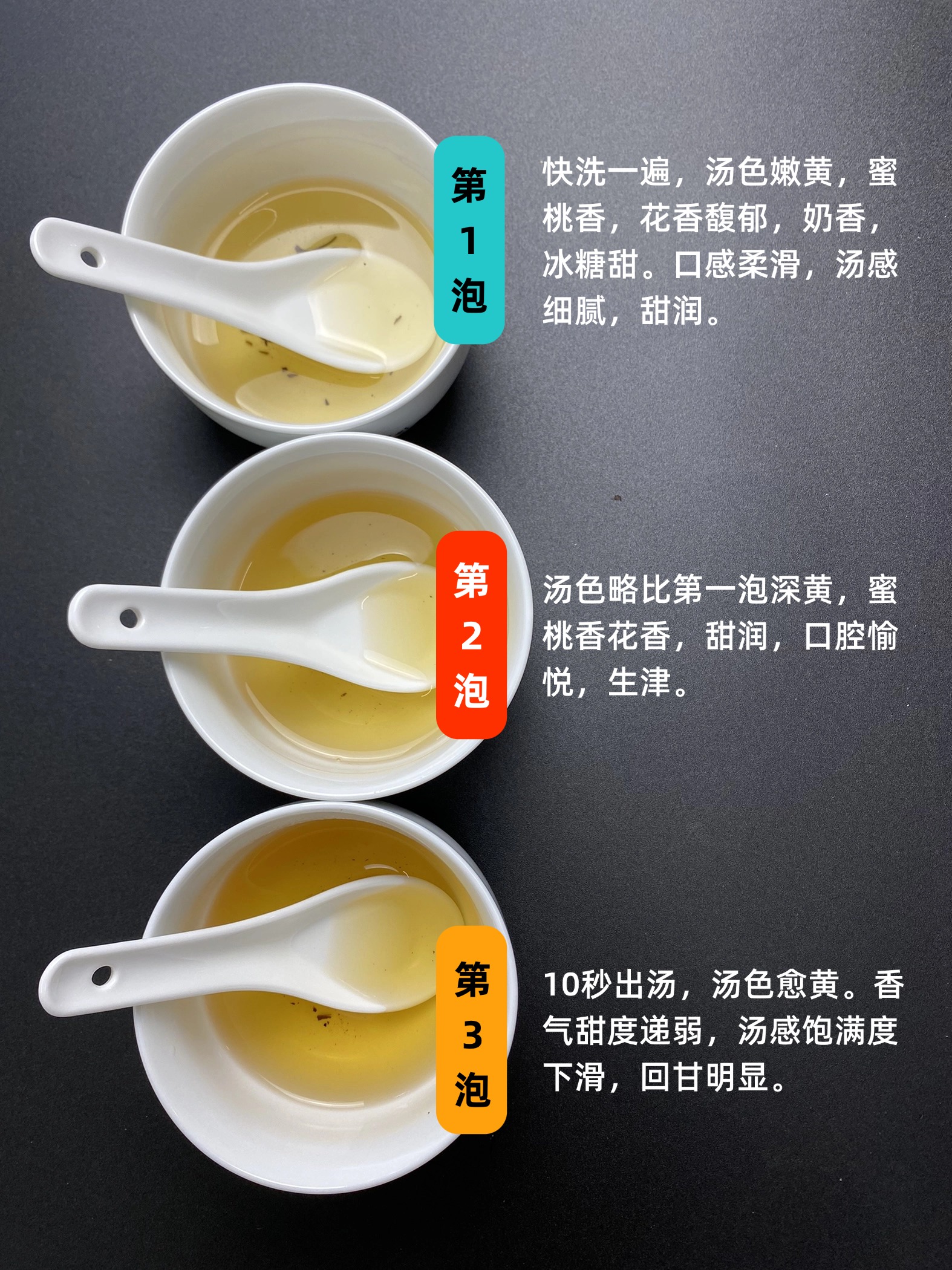 第二泡,汤色略比第一泡深黄,蜜桃香花香,甜润,口腔愉悦,生津。