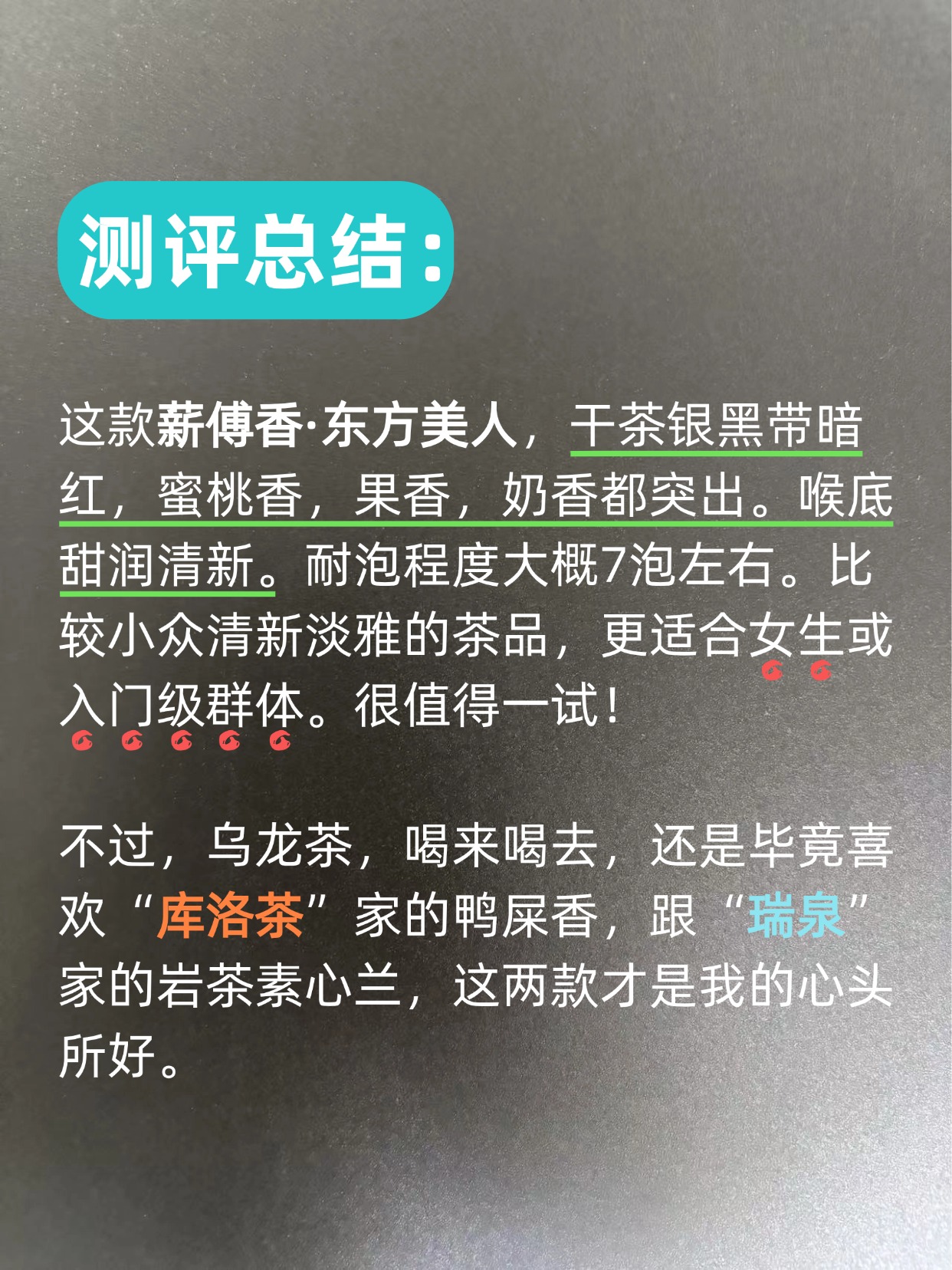 这款薪傅香·东方美人,干茶银黑带暗红,蜜桃香,果香,奶香都突出。喉底甜润清新。耐泡程度大概7泡左右。比较小众清新淡雅的茶品,更适合女生或入门级群体。很值得一试!