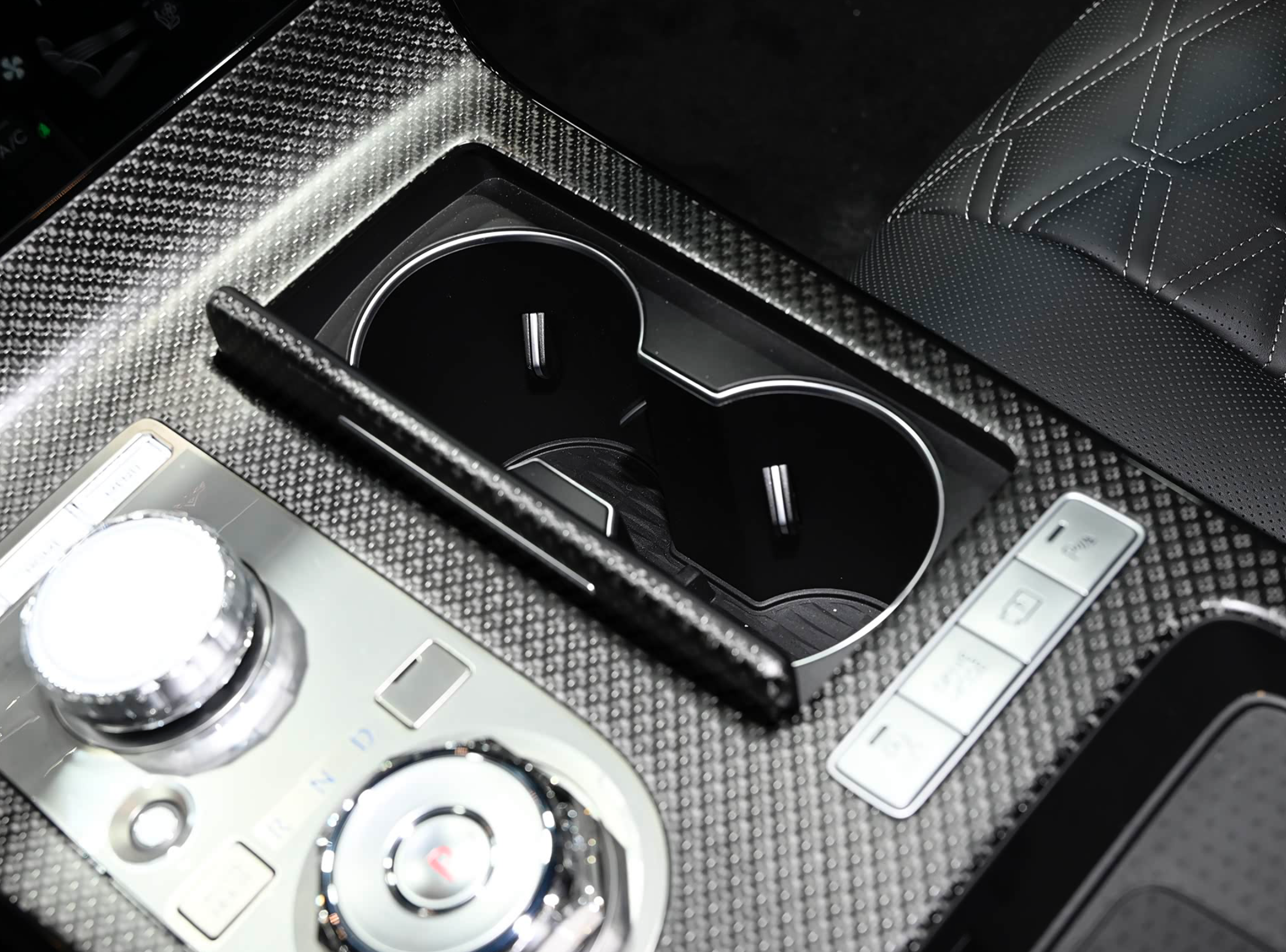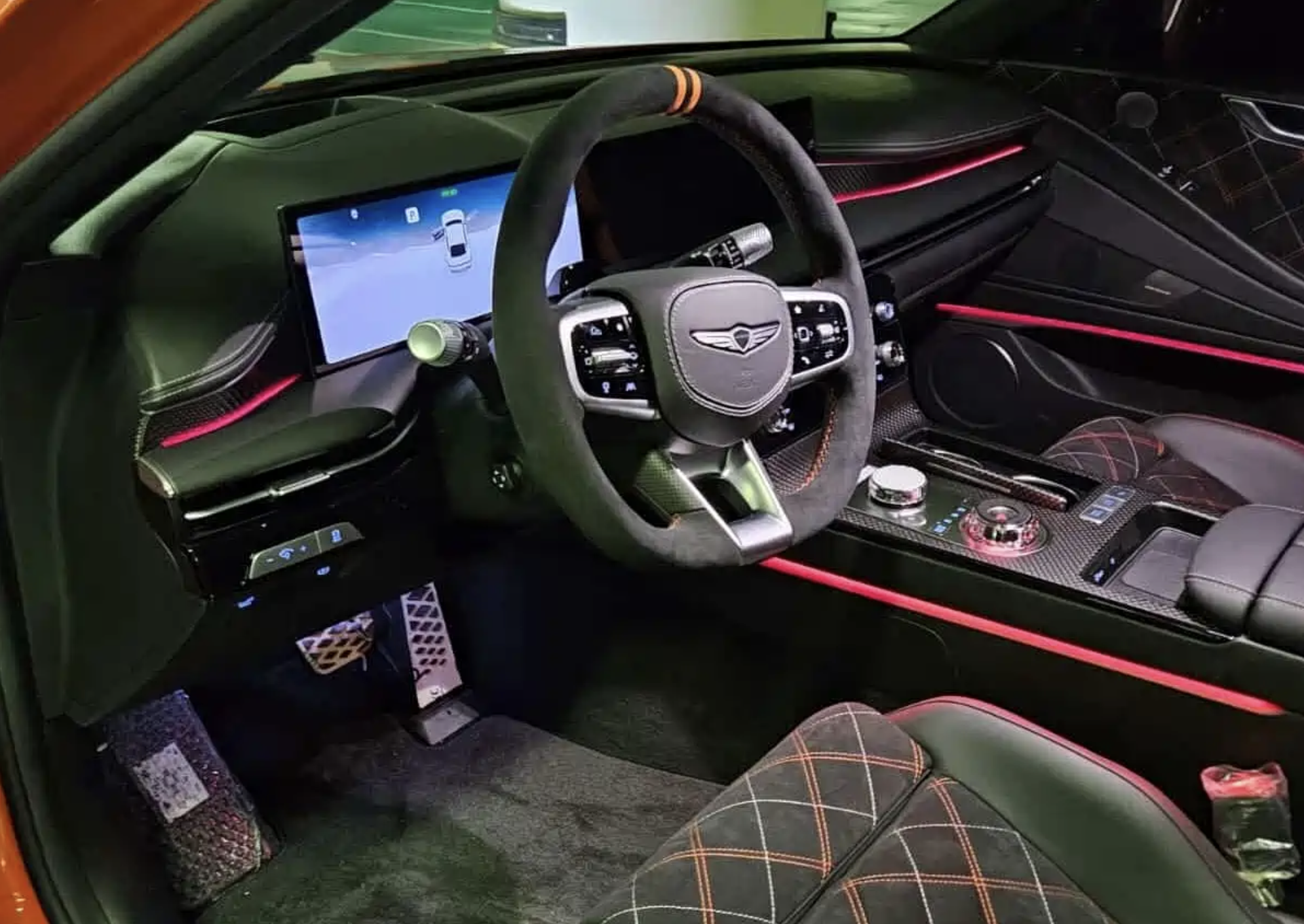 进入车内,捷尼赛思G80 Magma Special同样使用了大量Magma属性的元素,大面积黑灰色Alcantara面料的铺陈,标配了带有橙色背板的Recaro性能运动座椅,并在中控等位置采用大量碳纤维装饰,还加入了菱形交错的白橙缝线设计,就连车顶棚和地毯也都加入了黑色Alcantara面料铺陈,环抱式的座舱还加入了红色的装饰条、大尺寸碳纤维饰板、亮黑色钢琴烤漆装饰面板和圆形的大尺寸金属旋钮,将豪华与运动完美的结合起来。中控台配备了麂皮绒包裹的碳纤维赛车方向盘,操控岛还配备了圆形的换挡旋钮,带来了更好的操控体验。最新的车机系统和全新的UI设计交互,操作流畅,画质清晰,科技感方面与时俱进。旋钮式的驾驶模式切换和多色氛围灯,清楚地彰显了新车的豪华感与时尚感。