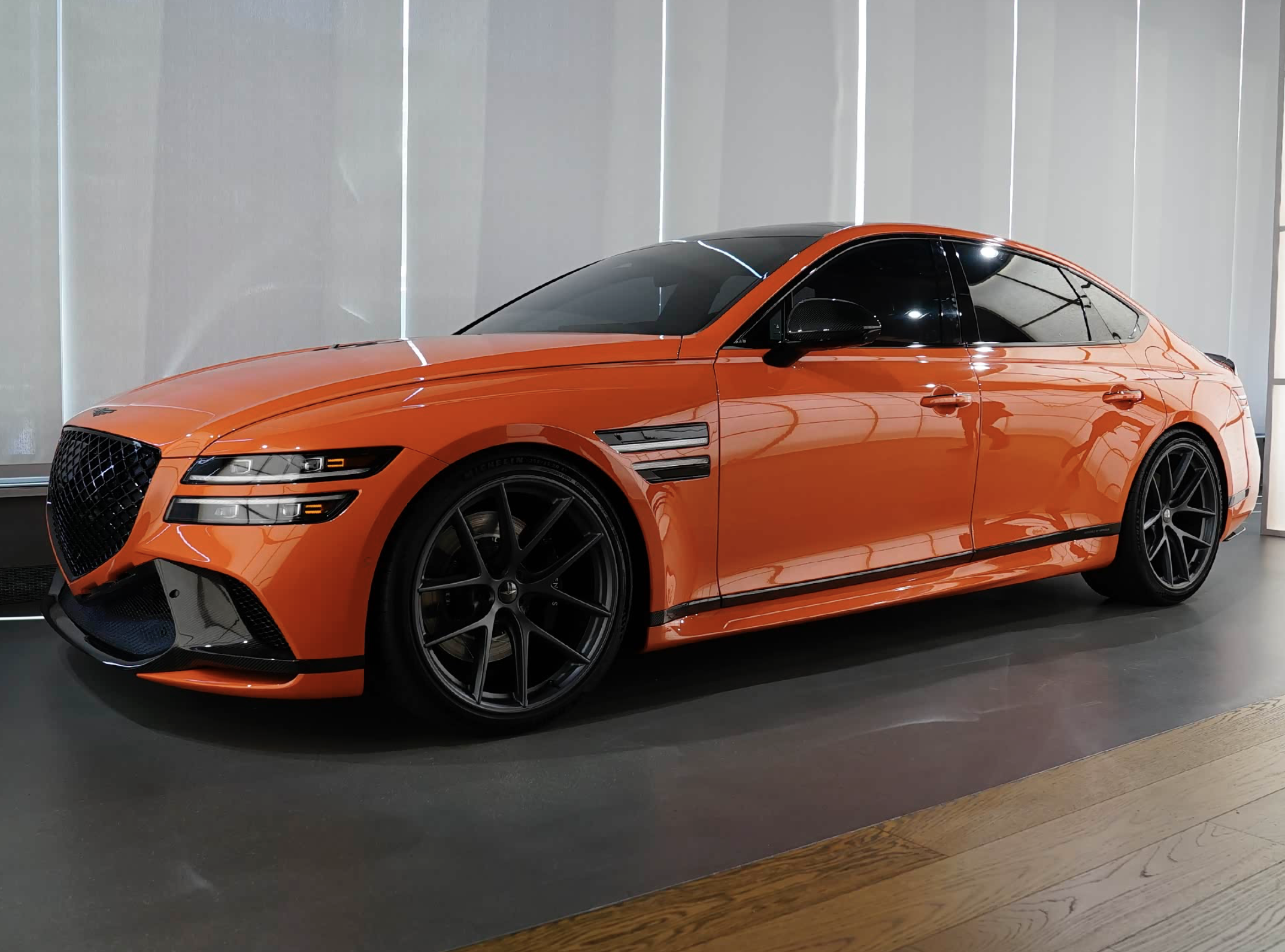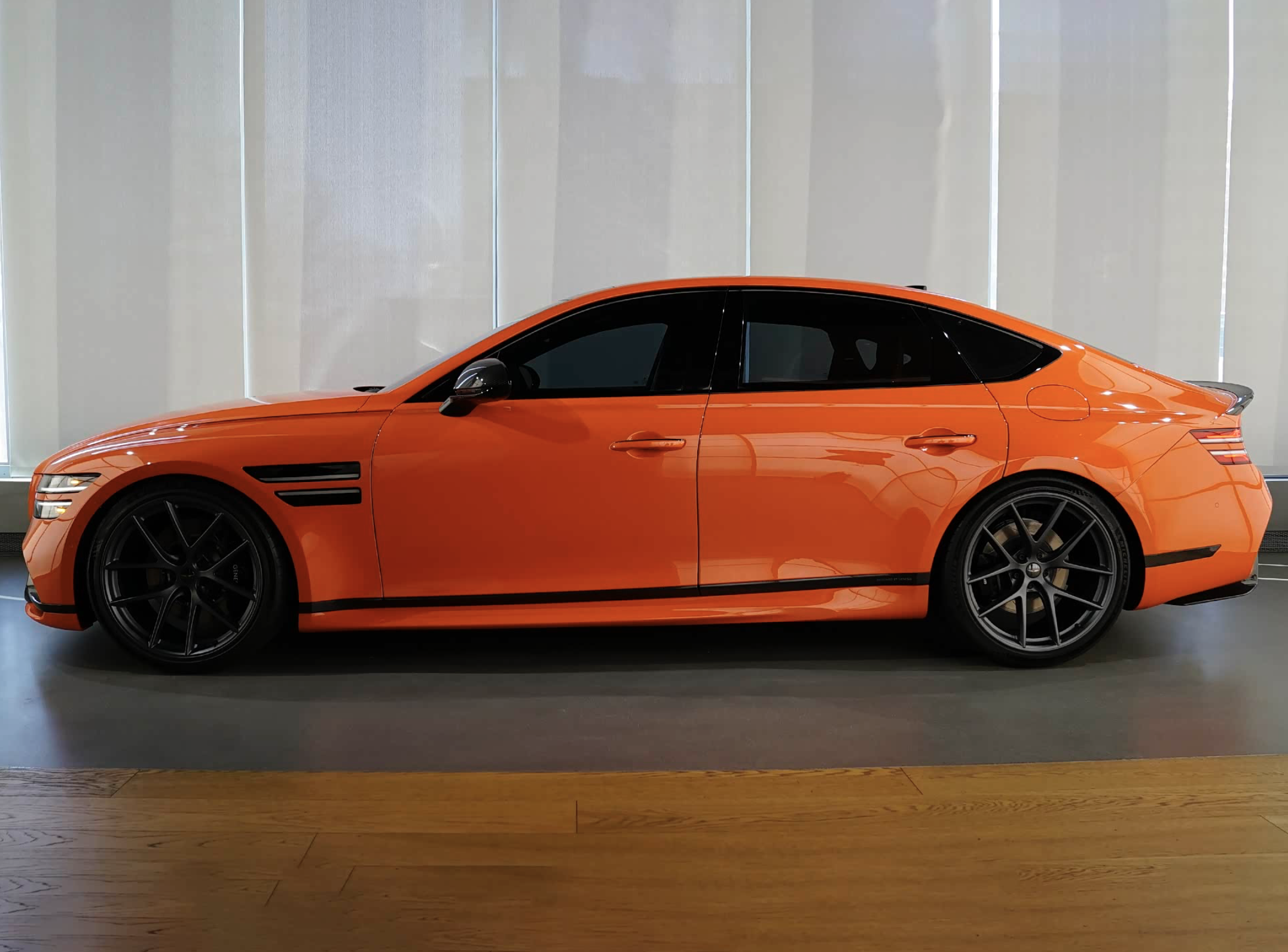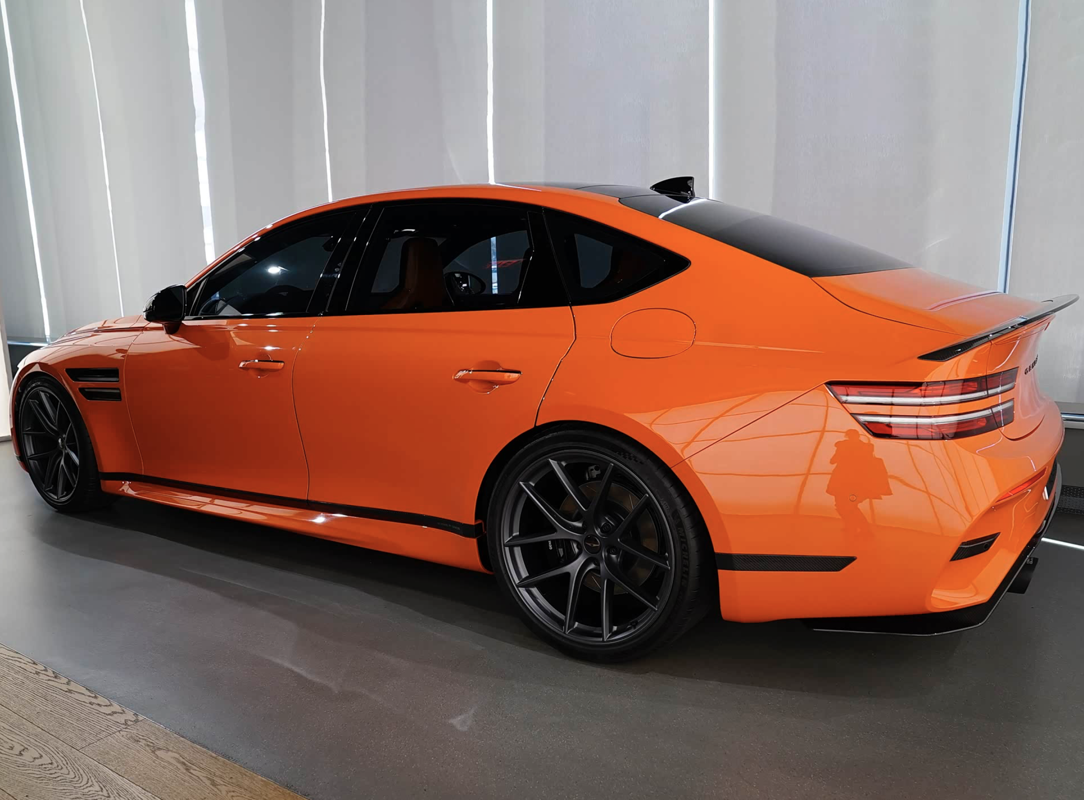 来到车身侧面,捷尼赛思G80 Magma Special采用了特殊调制的橙色车漆涂装,配合着黑色碳纤维材质的倒车镜外壳,21英寸双五辐式的轻量化轮圈,与之匹配了255/35 R21、295/30 R21规格的米其林PS4S高性能轮胎,以增强其运动性能和操控表现。还加入了大尺寸碳陶瓷刹车系统和大尺寸的刹车卡钳。尺寸上,捷尼赛思G80的长宽高分别为4995×1925×1465mm,轴距3010mm,厂家将它定位于中大型车,车内提供了5座布局。相比于奥迪A6L、宝马5系、奔驰E级来说要更加出色,油箱容积65L