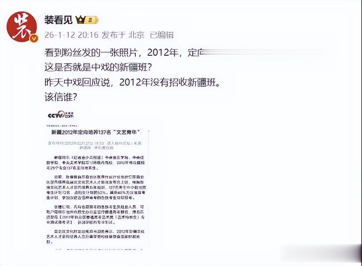 直到2026年1月11日,中戏终于发了声明,说2012年压根没招收过新疆班,林傲霏是按北京生源身份,正常参加考试录取到普通本科班的,网传信息不属实。