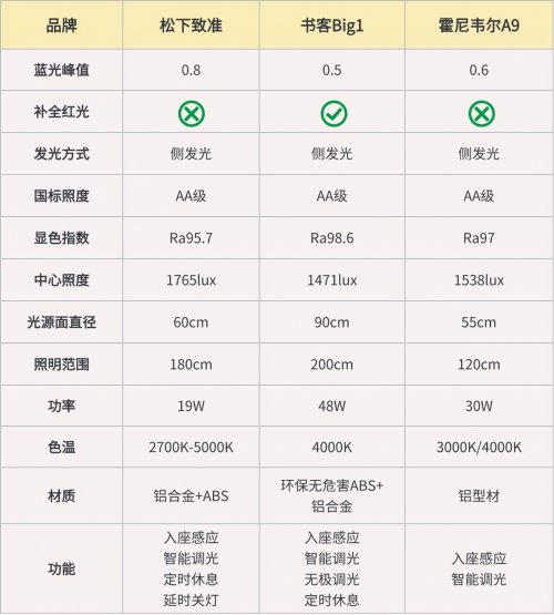 二、核心数据一览为了更直观地对比三款台灯的关键性能差异,以下表格汇总了书客Big1、霍尼韦尔A9和松下致准在核心参数上的实测数据,帮助大家快速了解各产品的优势特点。