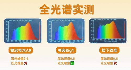从实测数据来看,书客Big1的表现最为出色,其蓝光峰值低至0.5,并具备明显的红光增益功能。这得益于其SunArc三芯片全光谱灯珠与RRT3.0红光养眼技术的协同作用,实现了“控蓝补红”的主动养护效果,光谱曲线连续平滑,最接近自然日光分布。霍尼韦尔A9的蓝光峰值为0.6,蓝光控制表现优秀,但是没有添加有益红光,无法缓解长时间用眼带来的疲劳感,养护效果稍逊。松下致准的蓝光峰值0.8,虽然符合安全标准,但在蓝光抑制和光谱完整性方面相对保守。