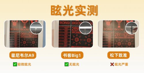 书客Big1依托全光域防眩光4.0技术与八重光学矩阵,实现了零眩光体验,实测中光面课本无反光点,直视光源时仅感柔和微光,无任何刺痛感。霍尼韦尔A9存在轻微眩光,特定角度下需要调整灯头位置来规避直射。松下致准的眩光问题较为明显,光面书本上会出现明显反光点,长时间使用时对眼睛的刺激感相对更强。