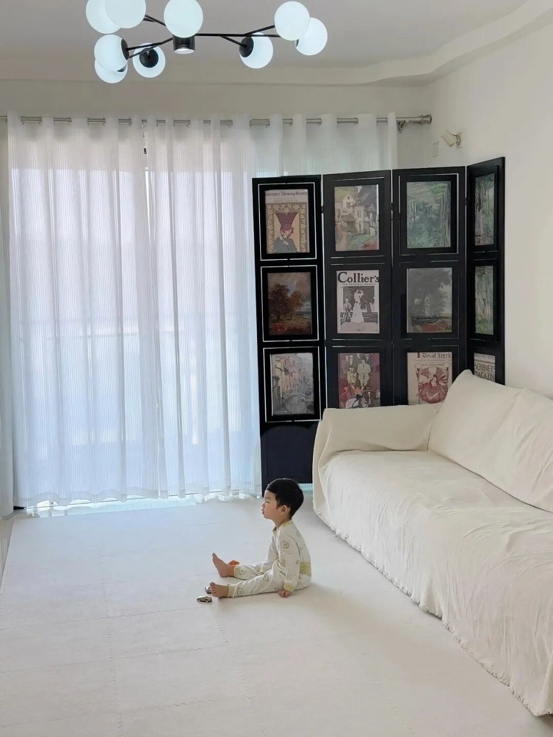 现在没有茶几阻挡,宝宝在客厅可以尽情玩耍,随便翻滚都不怕撞到,坐在爬爬垫上读绘本、玩玩具,也不怕着凉,幸福都变得具象化~