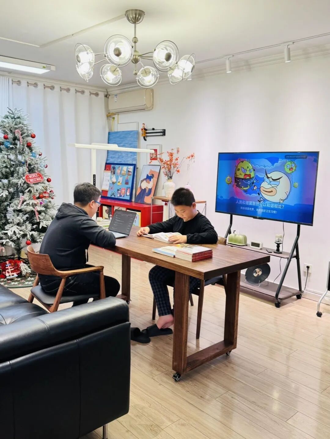 下午孩子放学回来,就是孩子的学习桌。孩子写作业,他在旁边看书,陪读,辅导功课。
