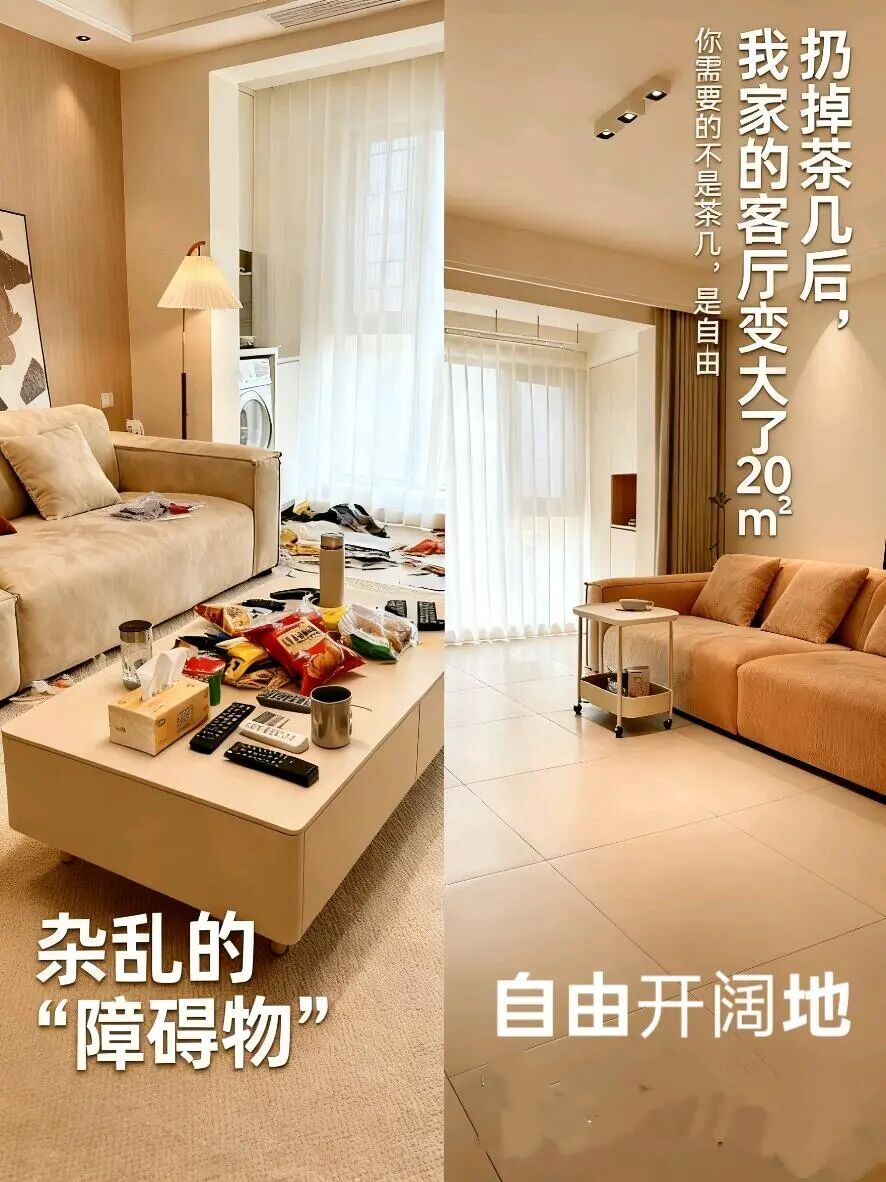 去看看身边人家摆了大茶几的,十个有九个上面都堆得乱七八糟:遥控器、抽纸、指甲刀、没吃完的零食、孩子的玩具、快递......茶几仿佛成了家里“杂物中转站”。