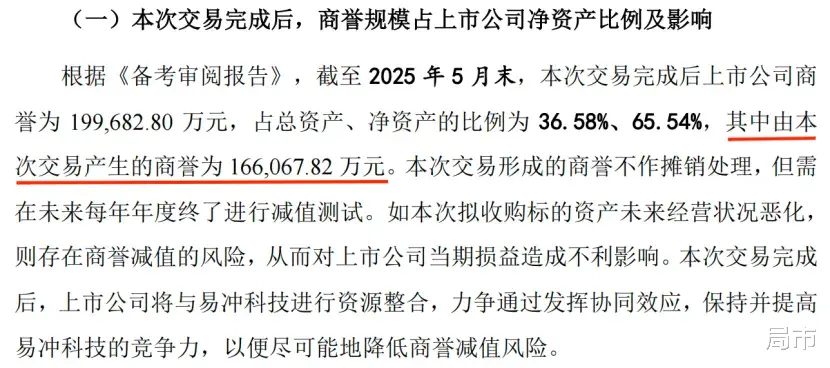 根据披露,截至2025年5月末,上市公司商誉的账面价值为3.36亿元,本次交易将新增商誉16.61亿元,交易完成后上市公司商誉为19.97亿元,占总资产、净资产的比例为36.58%、65.54%。