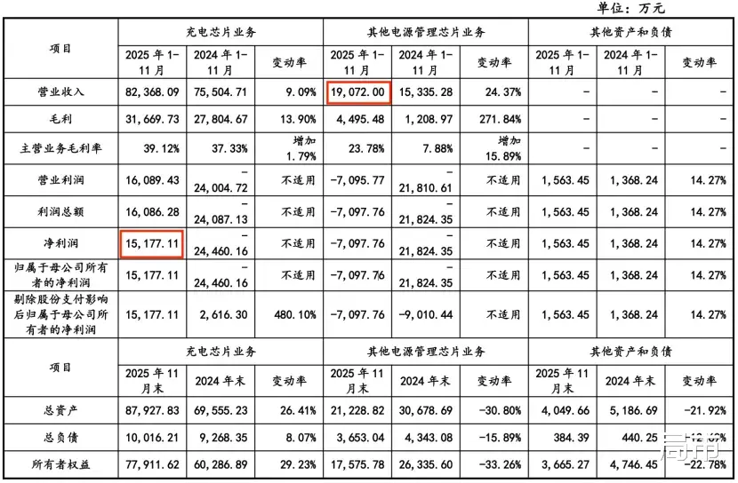 从业绩承诺口径,2025年1-11月,易冲科技充电芯片业务板块实现净利润1.52亿元,其他电源管理芯片业务实现收入1.91亿元,已提前达成2025年度业绩承诺目标。