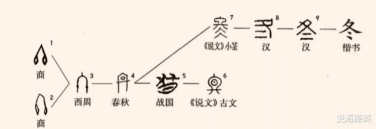《说文》说:“冬,四时尽也。从仌,从夂。”“四时尽”,是说“四季”走到头了。“仌”是古“冰”字;“夂”是古“终”字。这样说,“冬”是个会意字——四季终了,严寒成冰。
