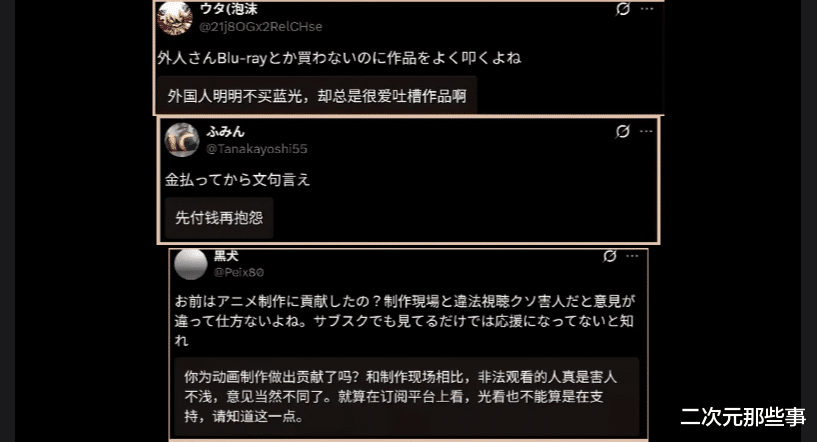 结果令人意外的是,日本粉丝不但没有理会欧美粉丝的诉求,甚至还嘲讽起了这些欧美粉丝。日本粉丝称欧美粉丝不爱买蓝光碟片又特别爱吐槽,还有人骂这些欧美粉丝是通过非法渠道观看动画的混蛋,他们对动画没有任何贡献,所以也不配抱怨。
