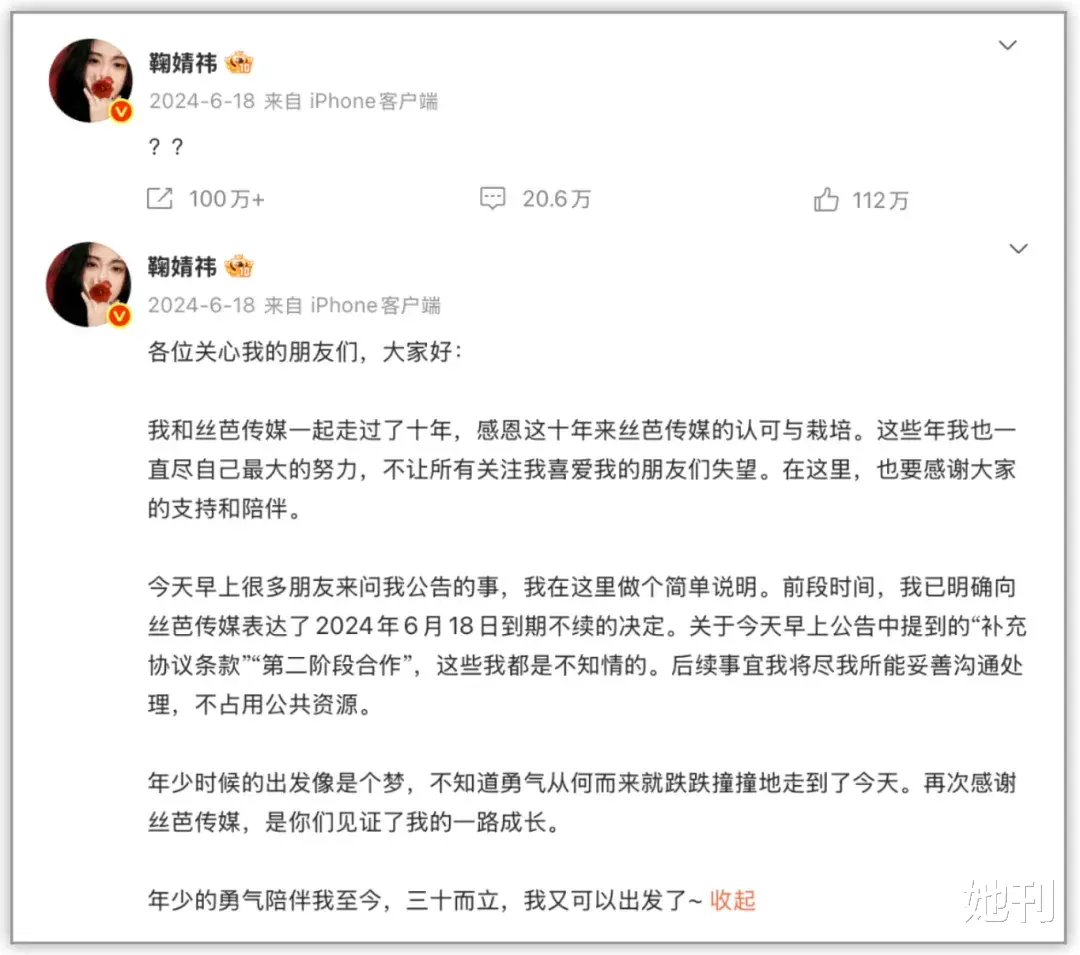 对此,鞠婧祎先是问号二连,随后称早已和公司表达过到期不续的决定,对公司所说“补充协议条款”“第二阶段合作”毫不知情。