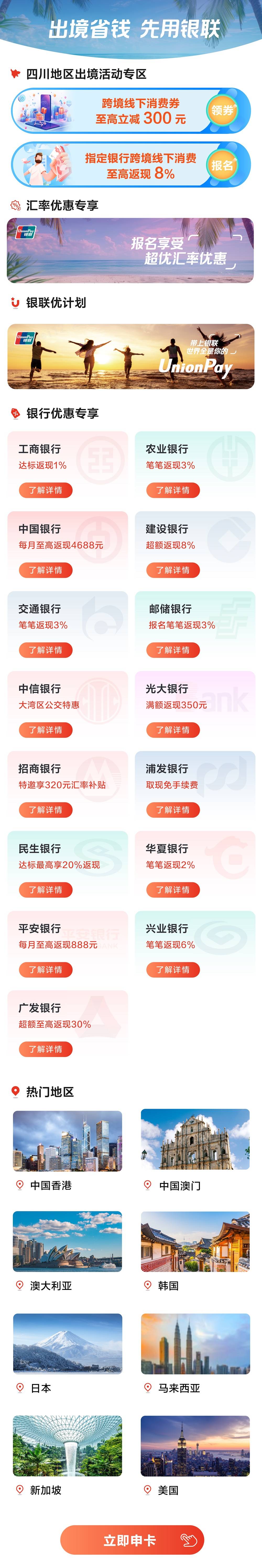 银联卡出境消费活动正火热进行中!从2025年4月27日起至2025年8月31日,用户在四川地区登录云闪付app可参与消费笔笔返现 5%、累计消费达标返现 8%、领券最高立减 300 元等活动,更有汇率优惠和合作银行专属权益大礼包等你来拿!