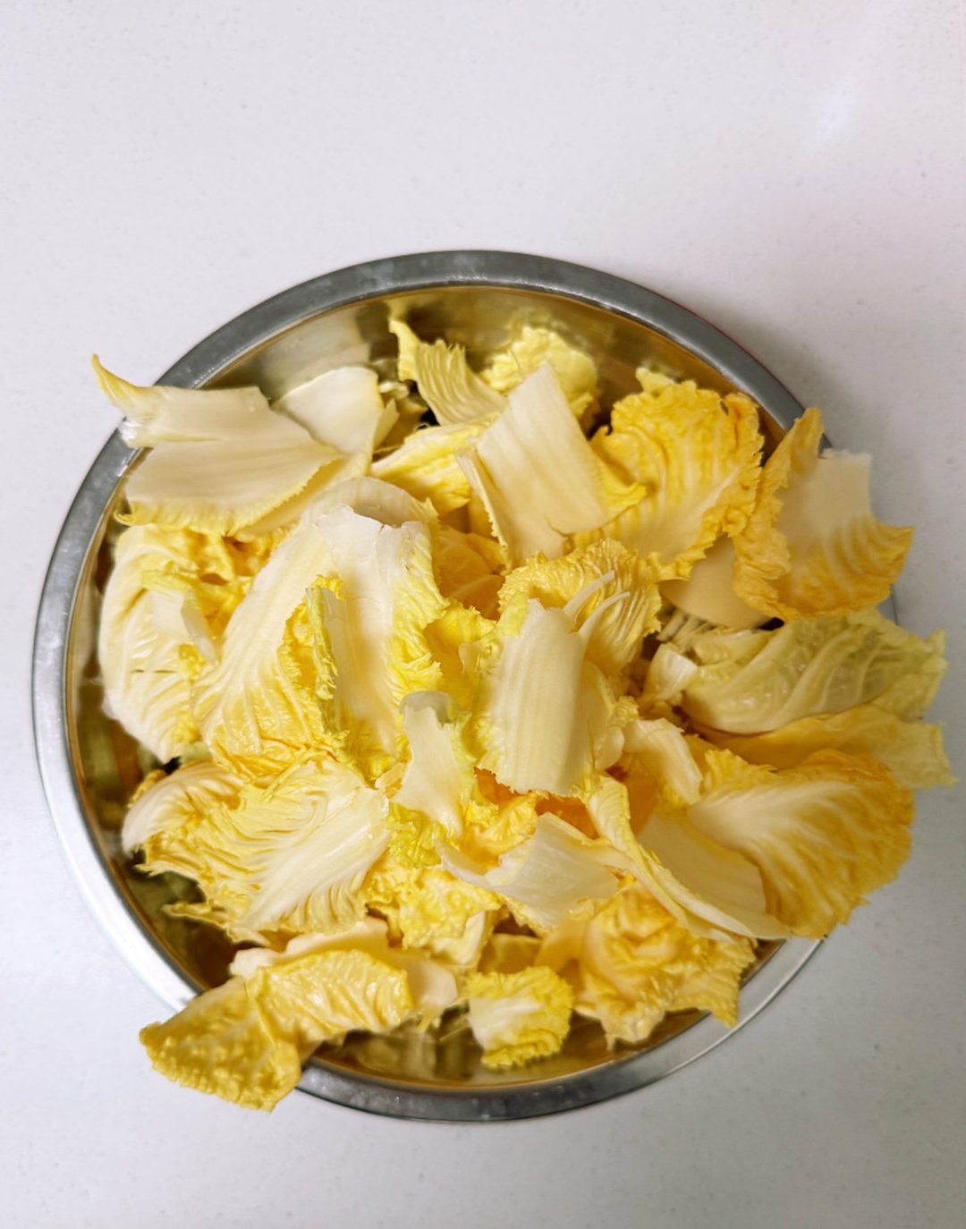 制作这道美味的第一步,在于对食材的精心处理。选取一颗鲜嫩的大白菜,我们只用最里面的嫩芯部分。将白菜芯细细洗净,随后关键的一步来了:必须用力甩干水分,或者用厨房纸吸干表面。水分残留会稀释酱汁,导致成菜水塌塌的,失去爽脆的灵魂。处理好的白菜芯无需刀切,直接用手掰成适口的大小。手掰的白菜断面粗糙,相比刀切更能吸附料汁,每一口都能爆汁,这是保证口感的第一要诀。