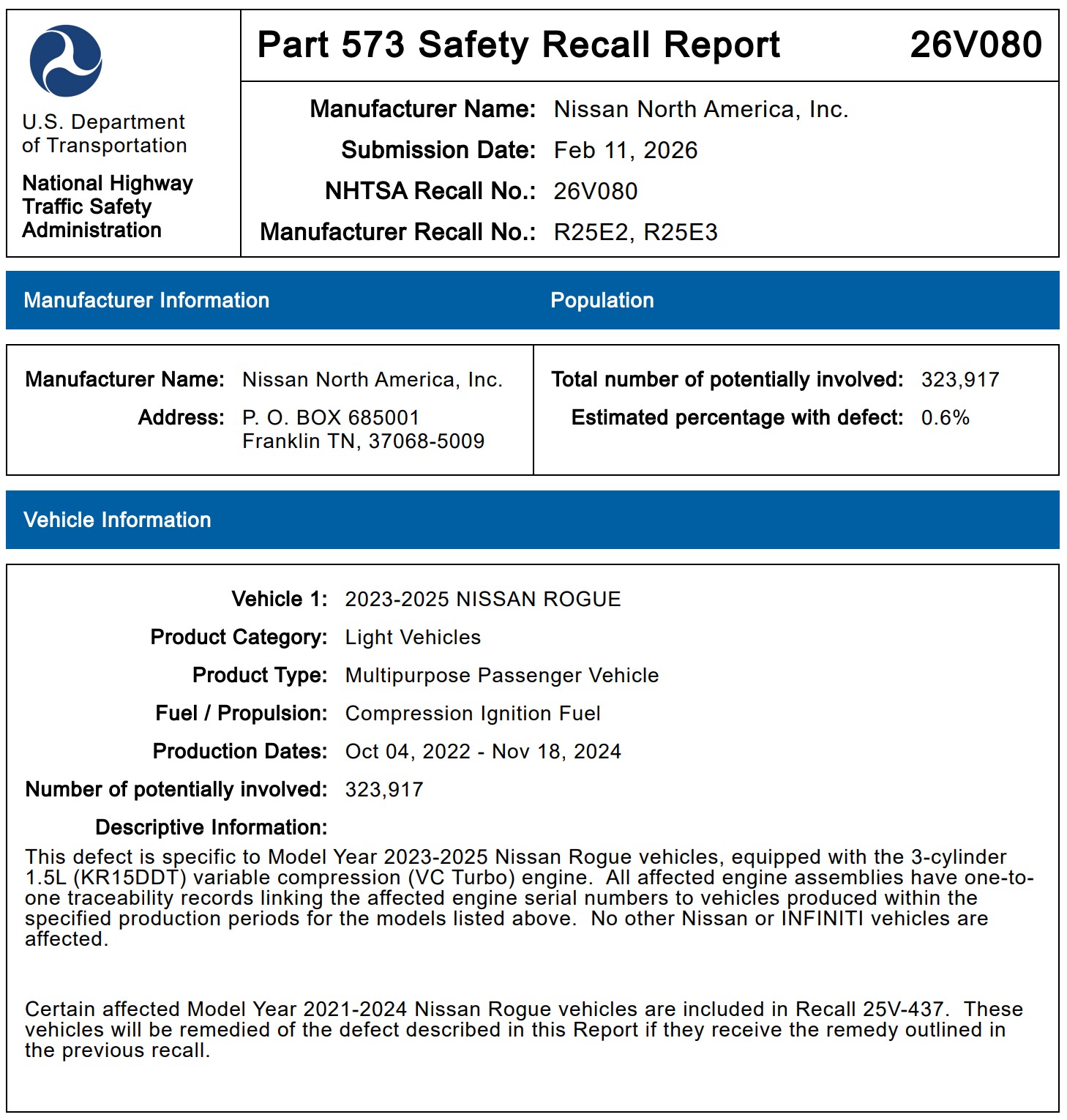 美国国家公路交通安全管理局于2月21日发布通告称,日产汽车将在全球范围内启动两项独立召回。召回车型为2023至2025款日产Rogue 1.5 VC Turbo版本,共计642986辆。