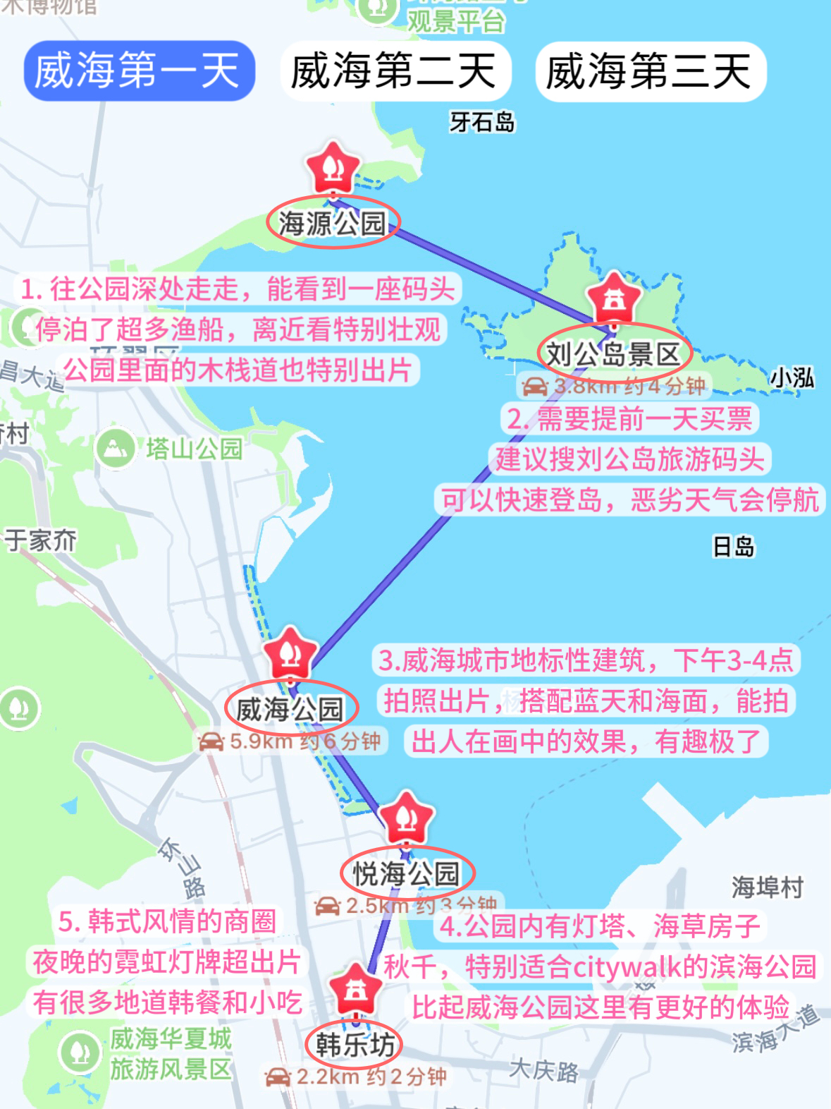 第一天早上到的威海,放下行李后开始玩,先去海源公园,然后去了刘公岛(这个花费时间比较长,至少要3小时),威海公园,悦海公园距离步行就到,晚上去韩乐坊吃了美食,然后就回酒店了🏨