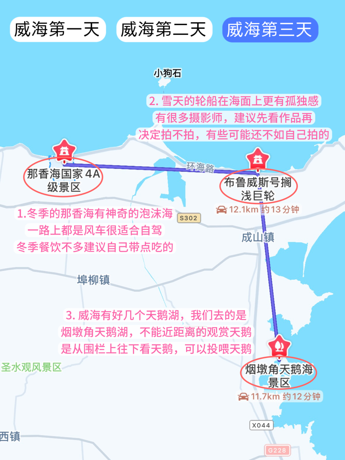 第二天早上去了江古咀打卡,然后去猫头山🐱,建议直接去3号观景台,其他的可以不去,葡萄滩主要是路牌打卡点,火炬八街我们来的时候人太多了,早上来人少,傍晚🌆去金海湾栈桥看日落第三天主要玩三个景点,那香海、布鲁威斯号、天鹅湖🦢都在荣成区,距离市区远,可以提前打好车