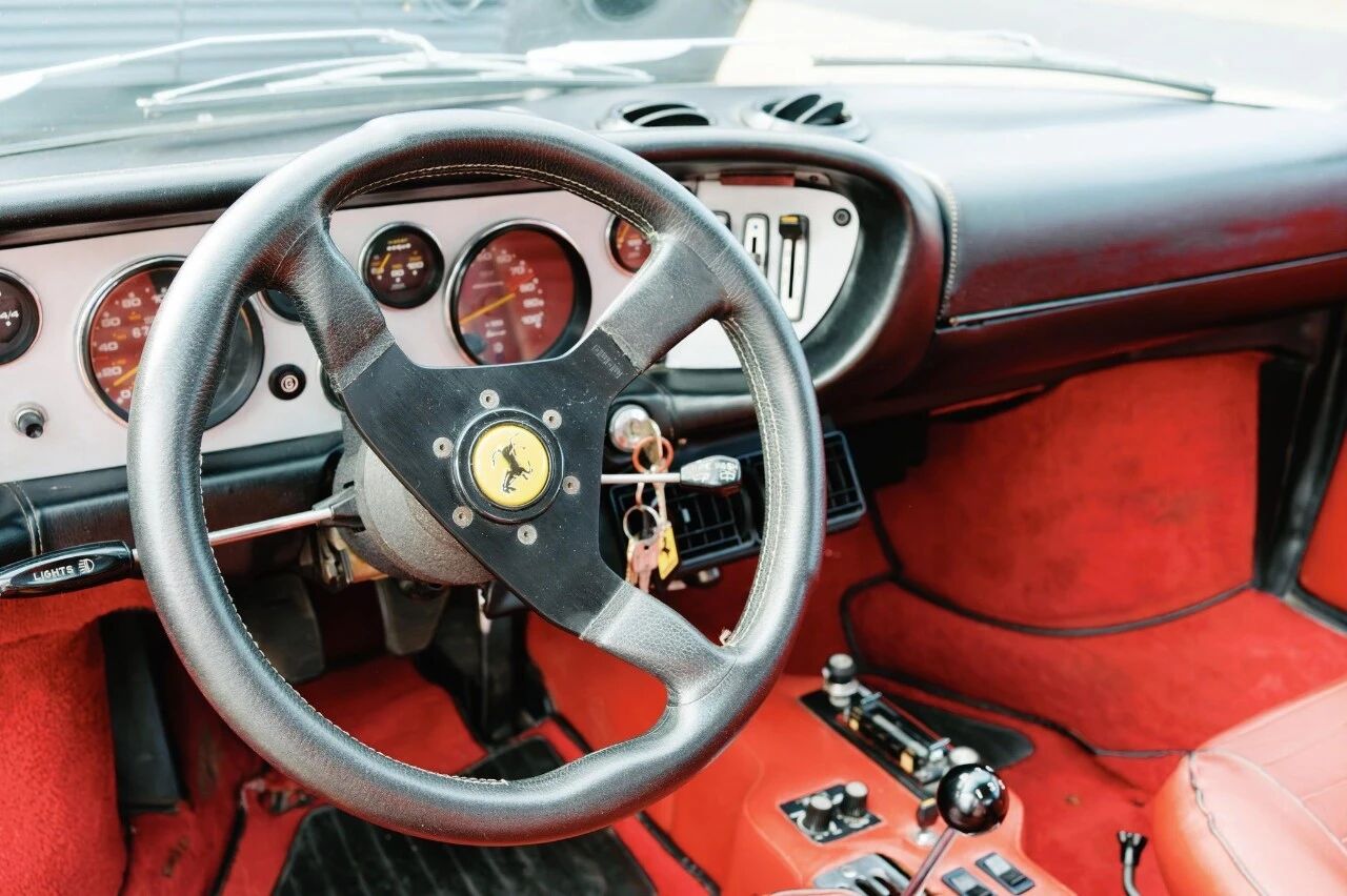 车上还保留了大量经典配置:14英寸复古轮毂、先锋卡带播放器、空调系统、MOMO方向盘、红色皮革内饰,每一处细节都在诉说70年代的汽车黄金时代。但必须清醒地说:这台法拉利不是完美车况,它是一台“有故事的车”。最关键的问题是,它在2015年发生过一次化油器引起的小火灾。虽然事故不大,但足以让它从“收藏级”变成“实用修复级”。