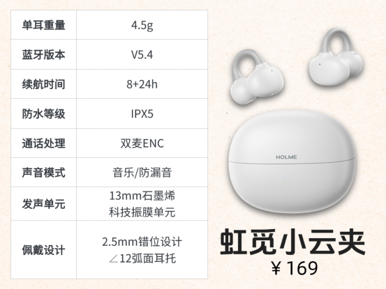 虹觅小云夹:虹觅小云夹单耳只有4.5g,戴起来特别轻巧舒服,长时间佩戴也不会有明显异物感,它还用到了前高后低的2.5mm错位结构,能适配各种不同的耳型,不管是运动还是日常通勤都能戴得稳又舒服,再加上12度弧面的耳托设计,耳机可以很好地贴住耳背,稳固性和舒适度都做得很到位