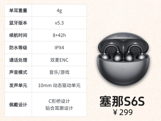 塞那S6S:这款耳机在设计上亮点突出,C形桥设计搭配贴合耳廓的造型,让整体与耳朵贴合度更高,再结合单耳4g的轻盈重量,带来了非常舒适的佩戴体验。