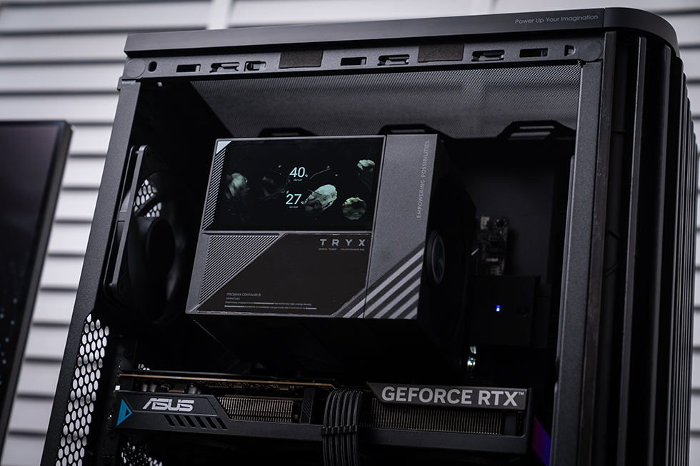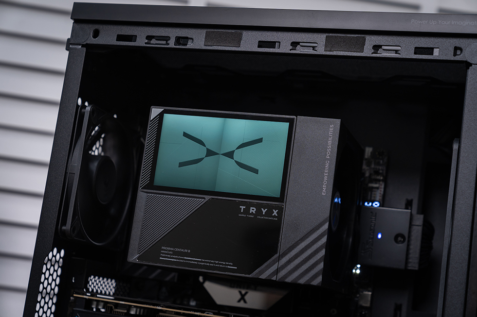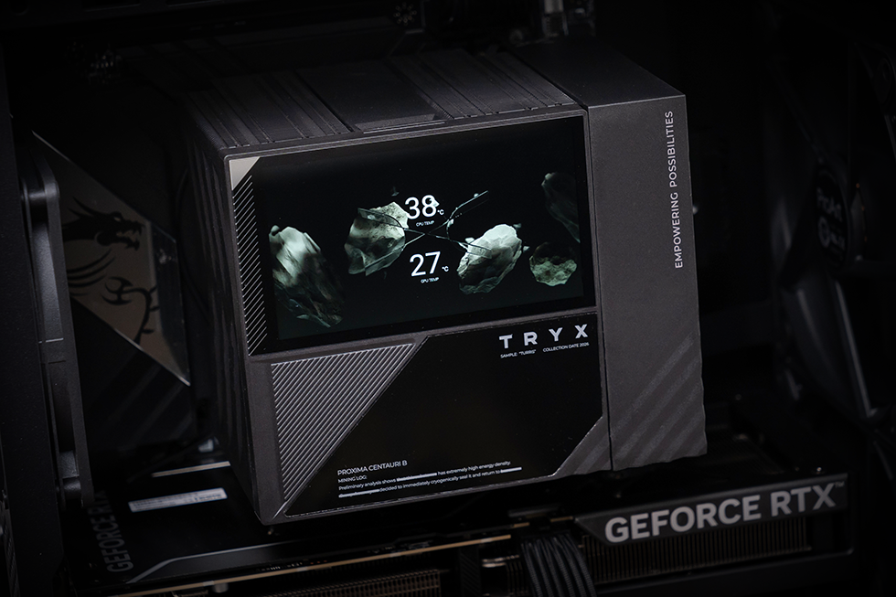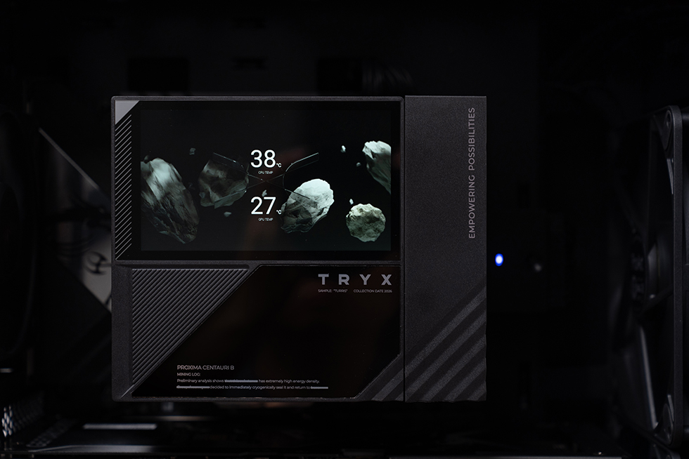 屏幕规格方面,采用1280x720分辨率、60Hz刷新率,亮度达到500尼特,显示清晰、色彩鲜艳,即使在机箱内光线较暗的环境下,也能清晰看到屏幕内容。屏幕模块通过USB 2.0插针与主板连接,实现供电与数据传输,安装便捷。开机动画为TRYX品牌LOGO动画,仪式感拉满,进入桌面后由配套软件接管屏幕显示,操作便捷。