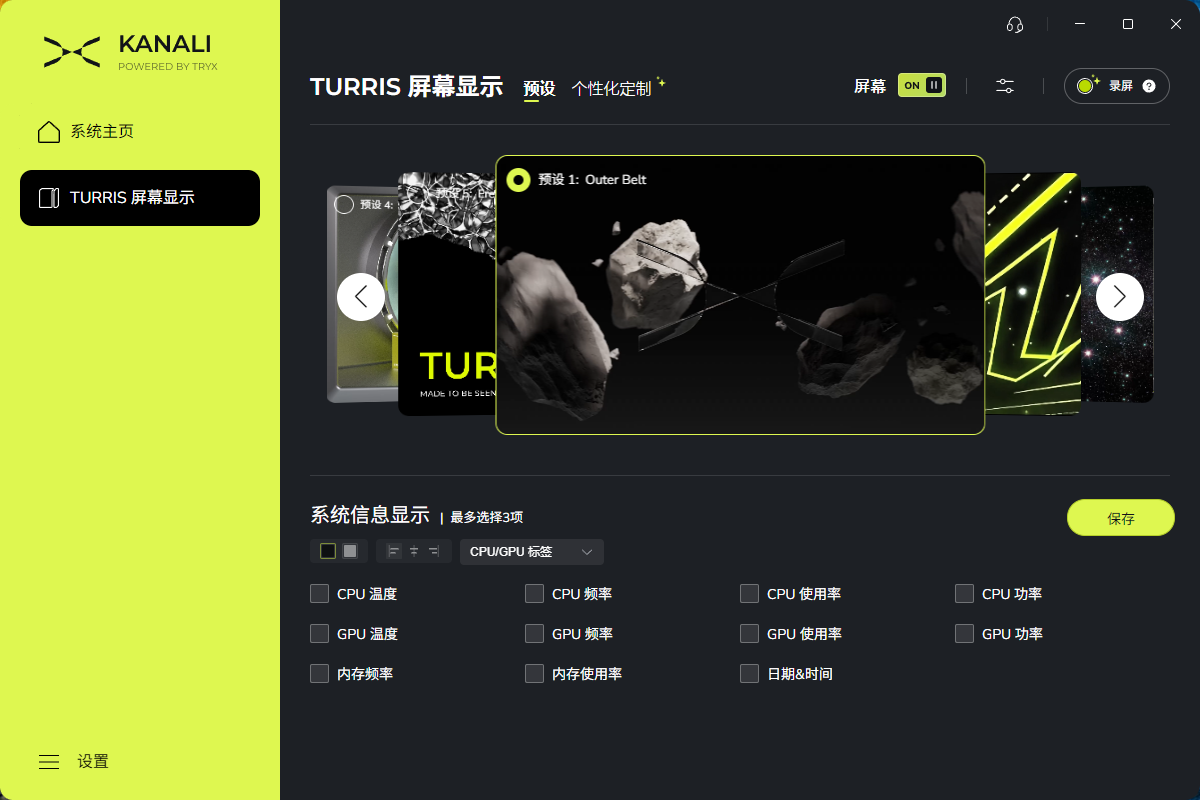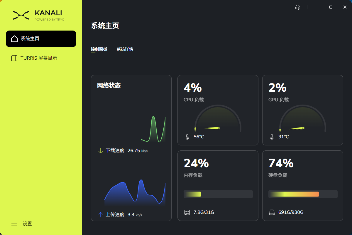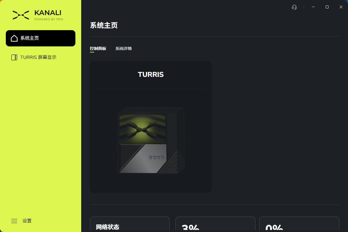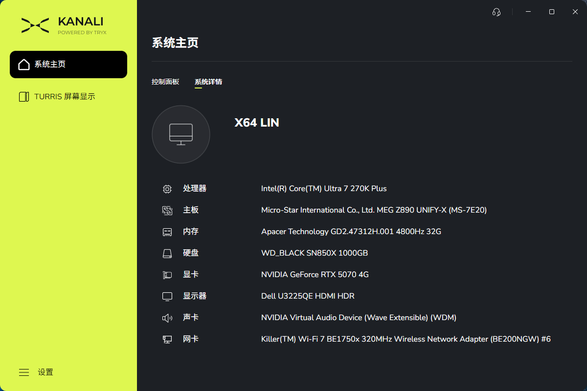 风屿620搭配TRYX KANALI配套软件,主要用于屏幕控制、硬件监控与个性化设置,形成“硬件+软件”的生态闭环,同时依托独立嵌入式系统,实现电脑资源“0”占用。软件界面简洁直观,操作便捷,无需复杂设置即可上手。核心功能包括硬件监控、屏幕设置、设置三大模块。软件首页可以看到设备列表、硬件实时监控信息以及系统详细信息。