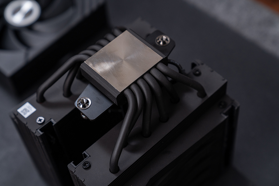 散热器侧面视角简洁规整,双塔结构对称分布,6根热管有序贯穿鳍片,采用无孔回流焊工艺,摒弃传统“开孔注锡”方式,不仅让热管与鳍片的焊层极薄且均匀,大幅降低界面热阻,还带来了浑然一体的洁净外观,成为高端散热器精湛做工的标志。底部铜底镀镍处理有效防止氧化与腐蚀,确保散热性能长久稳定。