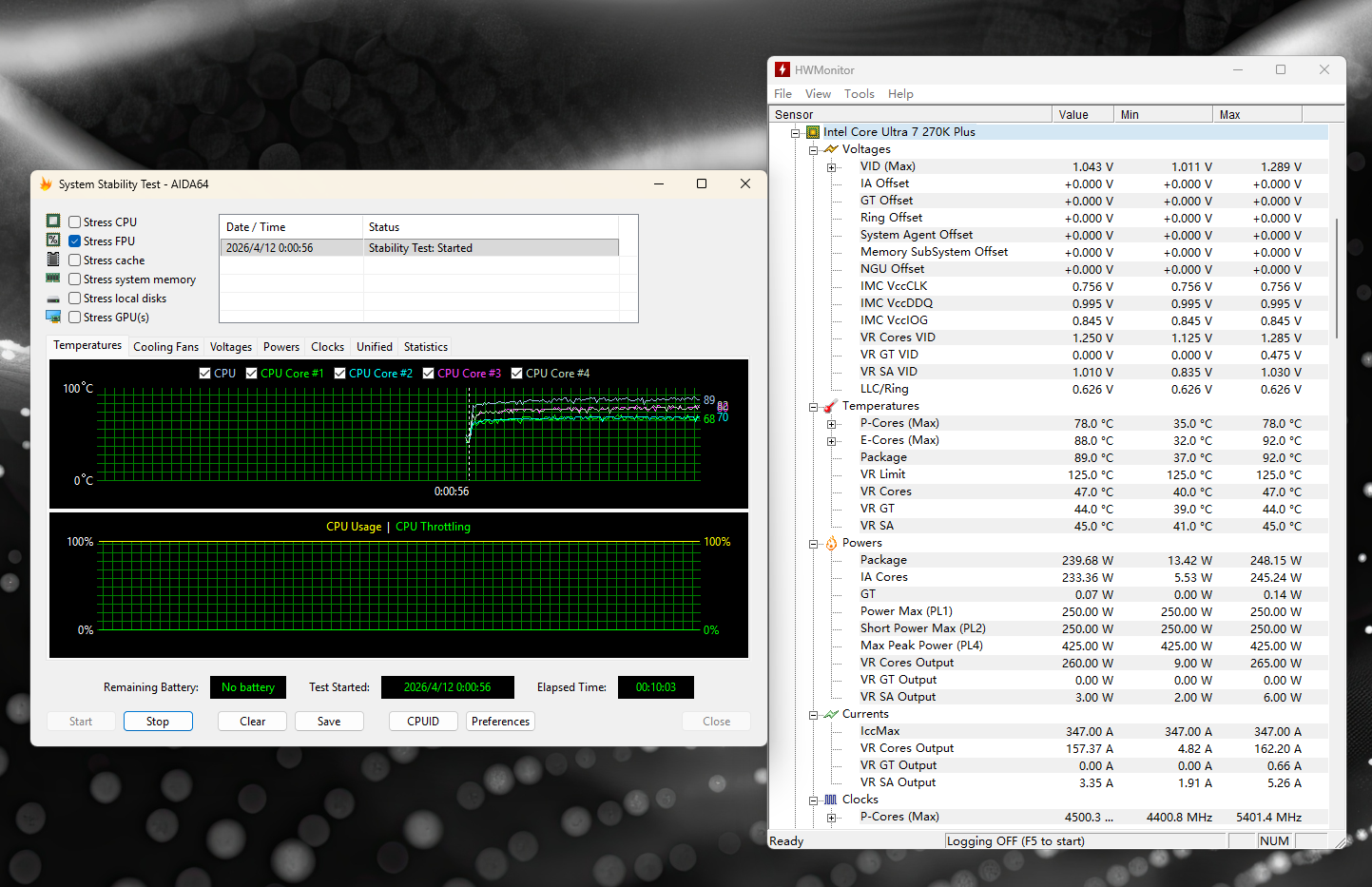 测试过程中,通过HW Monitor监测软件对CPU温度进行实时数据采集。空载待机状态下,CPU空载温度为37℃;经10分钟烤机测试后,CPU温度稳定于89℃ 左右(功耗239.68W)。能够轻松压制INTEL Ultra 270K Plus此类中高端CPU的温度,即使面对近250W的峰值功耗负载,也能将温度控制在92℃以内,作为一款风冷散热来讲对得起“旗舰”二字。