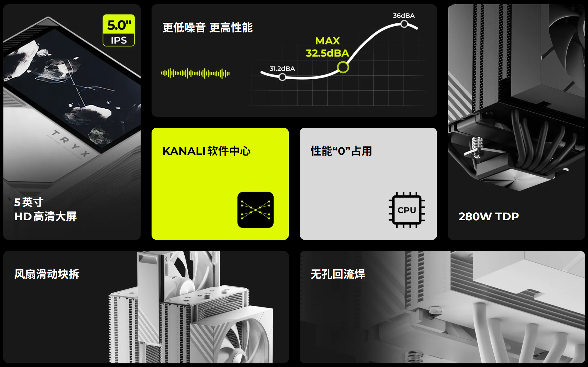 TRYX风屿620是一款定位高端的双塔风冷散热器,也是品牌推出的首款风冷产品,核心定位是“高效散热+极致静音+个性屏显”,专为追求安静高效运算环境、注重装机美学的用户设计。产品采用双塔双风扇架构,搭载6根6mm复合热管,热设计功耗(TDP)达到280W,可轻松应对旗舰级CPU的散热需求。其最大亮点在于集成了一块5英寸LCD高清屏幕,支持实时硬件状态监控与个性化内容展示,搭配独立嵌入式系统,实现电脑资源“0”占用。此外,产品提供黑白两种配色,支持主流Intel与AMD平台,在风扇设计、扣具优化、兼容性等方面均有针对性升级,兼顾实用性与体验感,试图推动风冷散热器从“古典”走向“现代”。