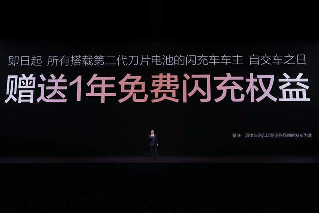 发布会现场,王传福还宣布:所有搭载第二代刀片电池的闪充车车主,均享有重磅“闪充权益”,自交车之日起,在全国闪充站可享受1年的免费闪充权益,让闪充体验更畅快。并且,在闪充免费期结束后,比亚迪闪充站也会同行业保持一致,不会额外收费。