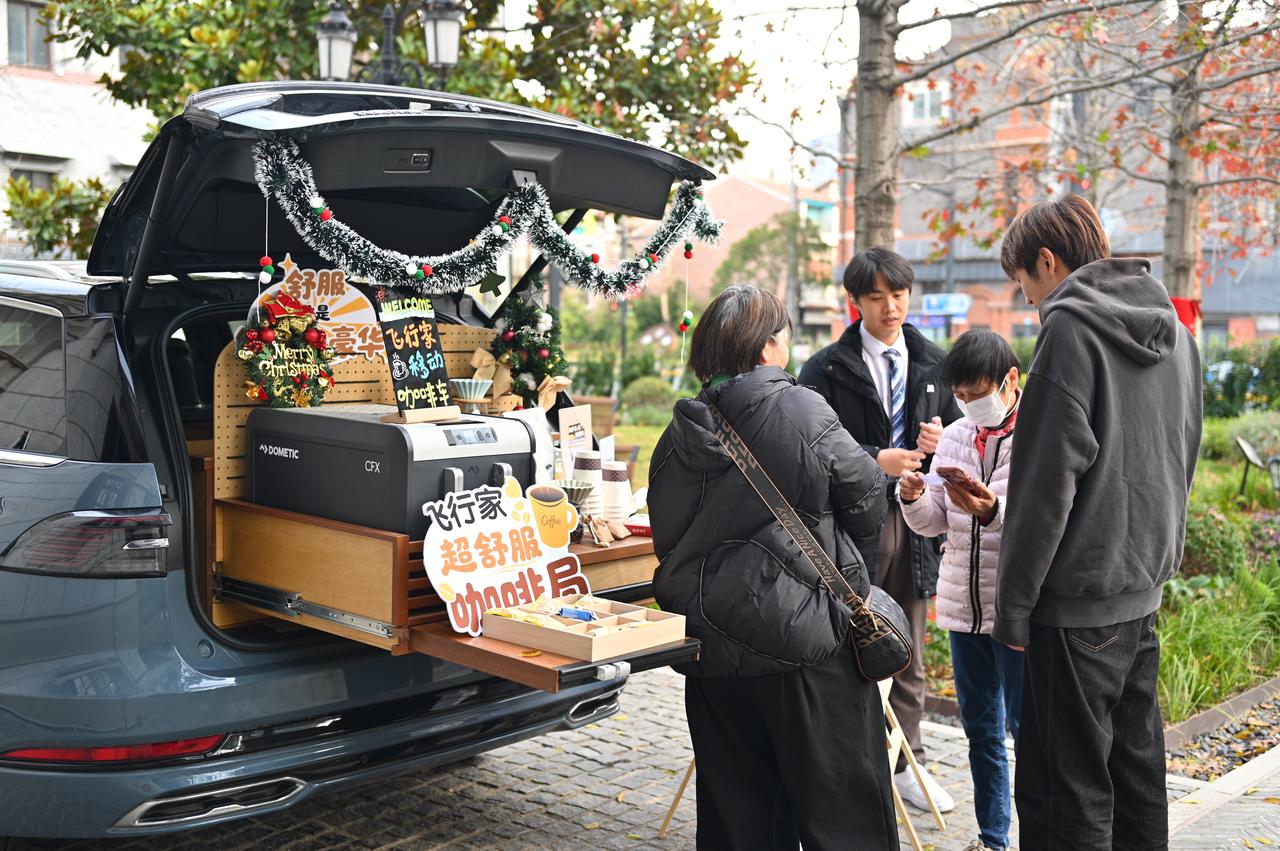 刚走没两步,就瞅见路边围了一圈人,凑过去一看,好家伙!这不就是我的同款座驾嘛!后备箱直接改成了咖啡车,扫码就能免费领咖啡,操作简单到飞起!捧着热咖啡,想起了今年的点点滴滴。