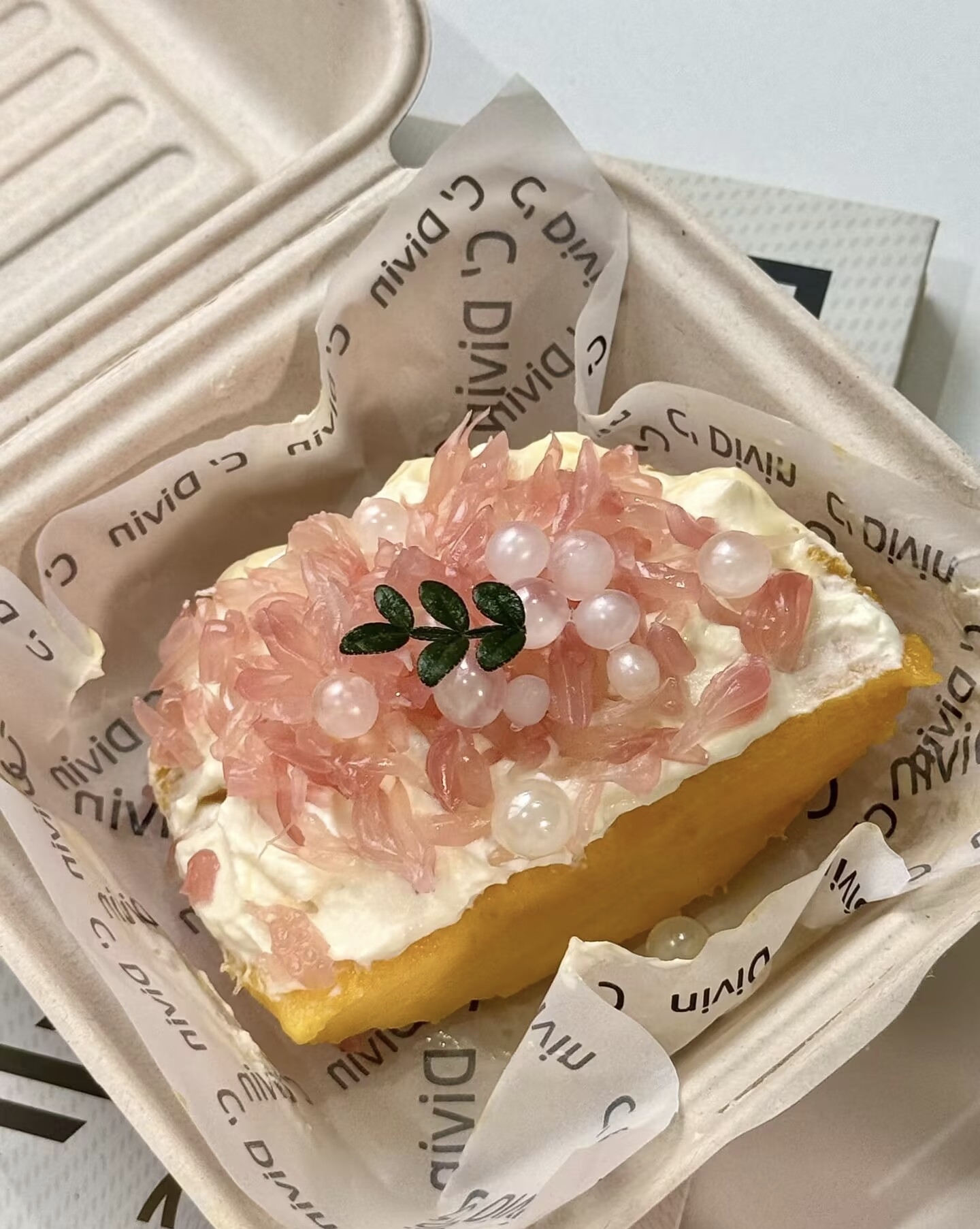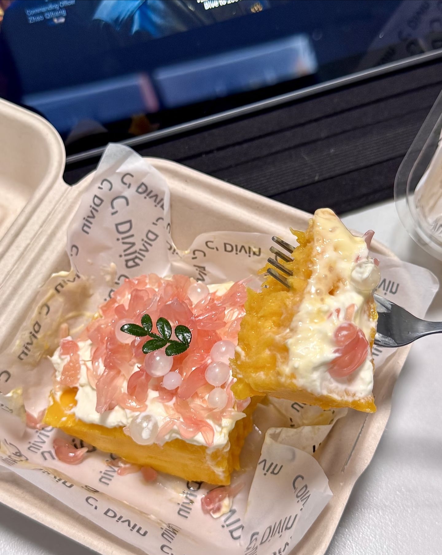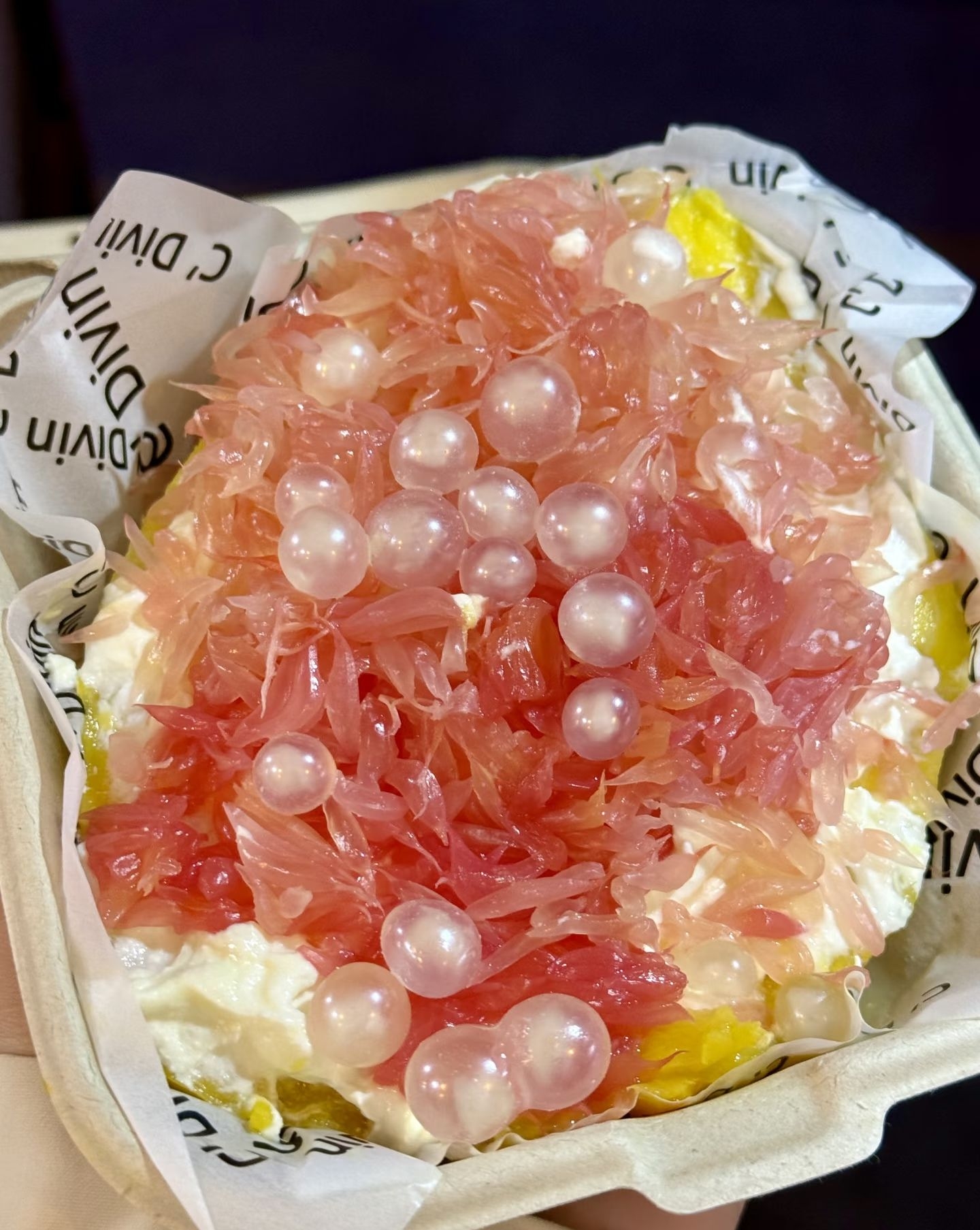 而且,这款固体杨枝甘露的果肉含量真的不少。你能清楚地看到和感受到里面的大块芒果和柚子果肉,果肉的口感也很真实,芒果软糯,柚子微苦,两种水果的风味相互交织,层次感特别丰富。这种真实的果肉体验,让整个甜品不仅仅是甜,还多了一份水果的清新。
