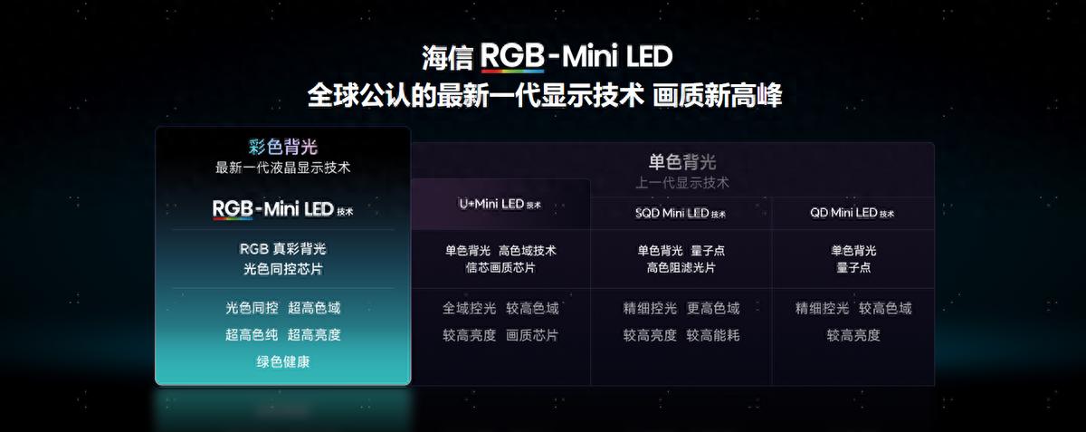 说实话,一开始我们也被各种专业术语绕得头晕,直到深入了解才明白,选高端电视的核心,其实是选对显示技术。市面上的SQD-Mini LED、QD-Mini LED本质还在用单色背光加量子点,通过高亮度激发色彩,背光原理和普通Mini LED比没有本质变化;而海信E8S搭载的RGB-Mini LED技术,实现了背光的三原色直出,因为是彩色光源,天生就是自然好颜色。由海信开创的RGB-Mini LED技术正是当前全球公认的最新一代显示技术,也是真正能解决画质、能效、护眼“不可能三角”难题的存在。