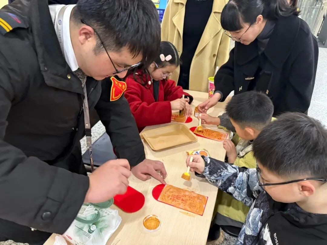 除了传统的写福送春联,一系列趣味盎然的民俗手作活动,也让这个新年变得生动而富有创意。在苏州湾东站,乘客们体验非遗年俗,将“平安喜乐”的祝福拓印于精美信笺之上;在烟雨桥站,大家动手制作宫廷洒金卡,感受古典工艺的精致。