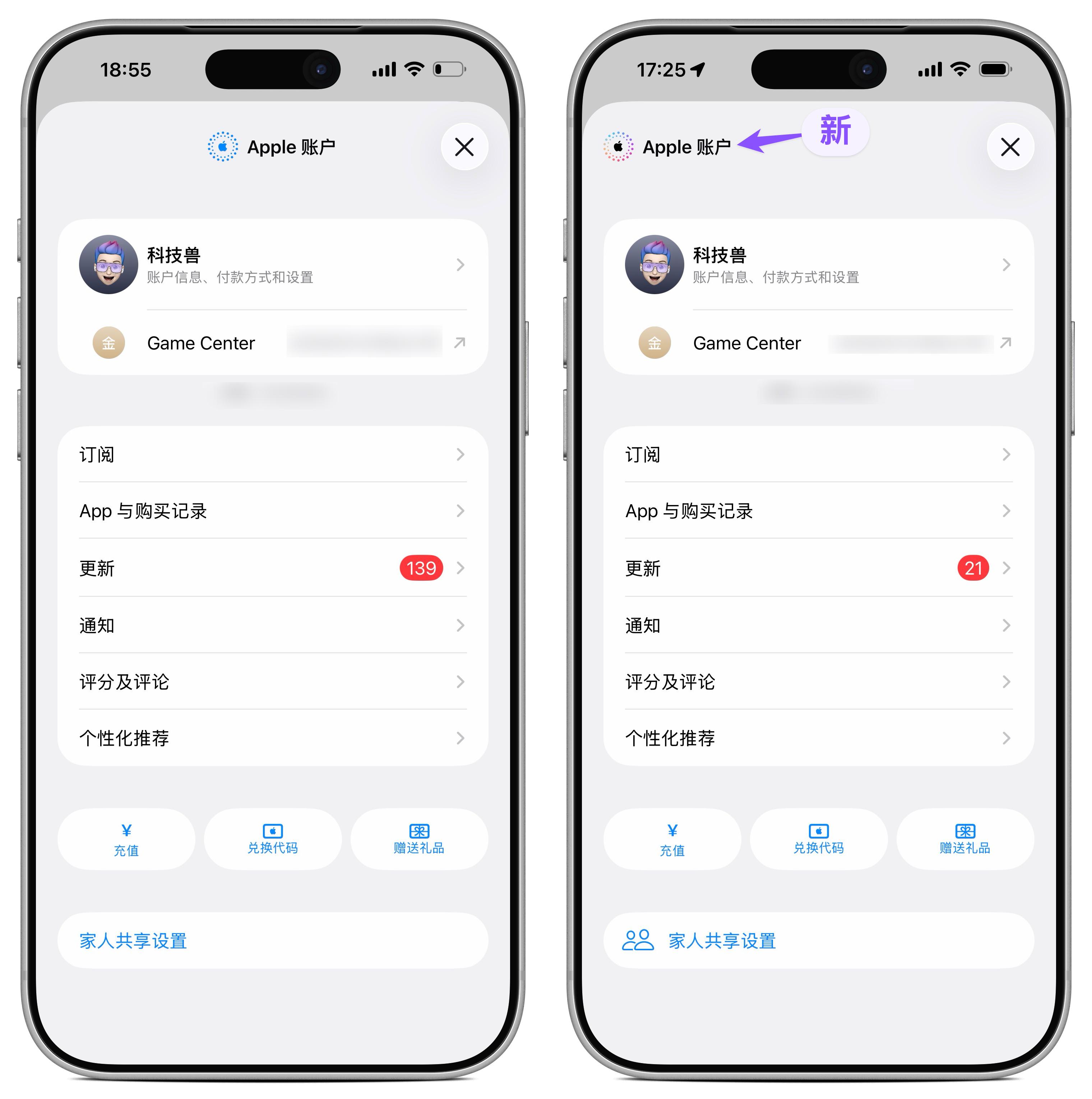 Apple 账户页面小幅改版苹果对带有 Apple 账户管理入口的系统应用进行了统一微调,包括 App Store、Apple Music、播客等。现在顶部 Apple 账户的图标改为彩色样式,整体布局由居中改为靠左排列。