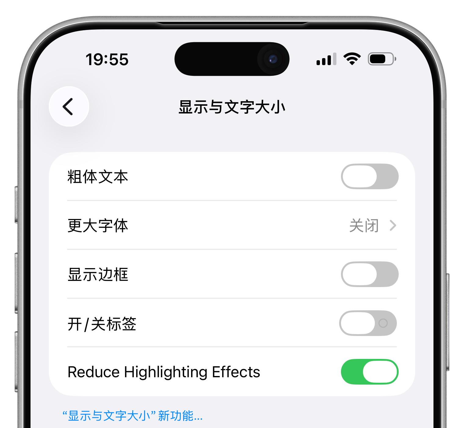 新增「减少高亮效果」开关在「辅助功能 → 显示与文字大小」中,Beta 2 新增了一个尚未汉化的开关,字面含义为减少高亮效果。