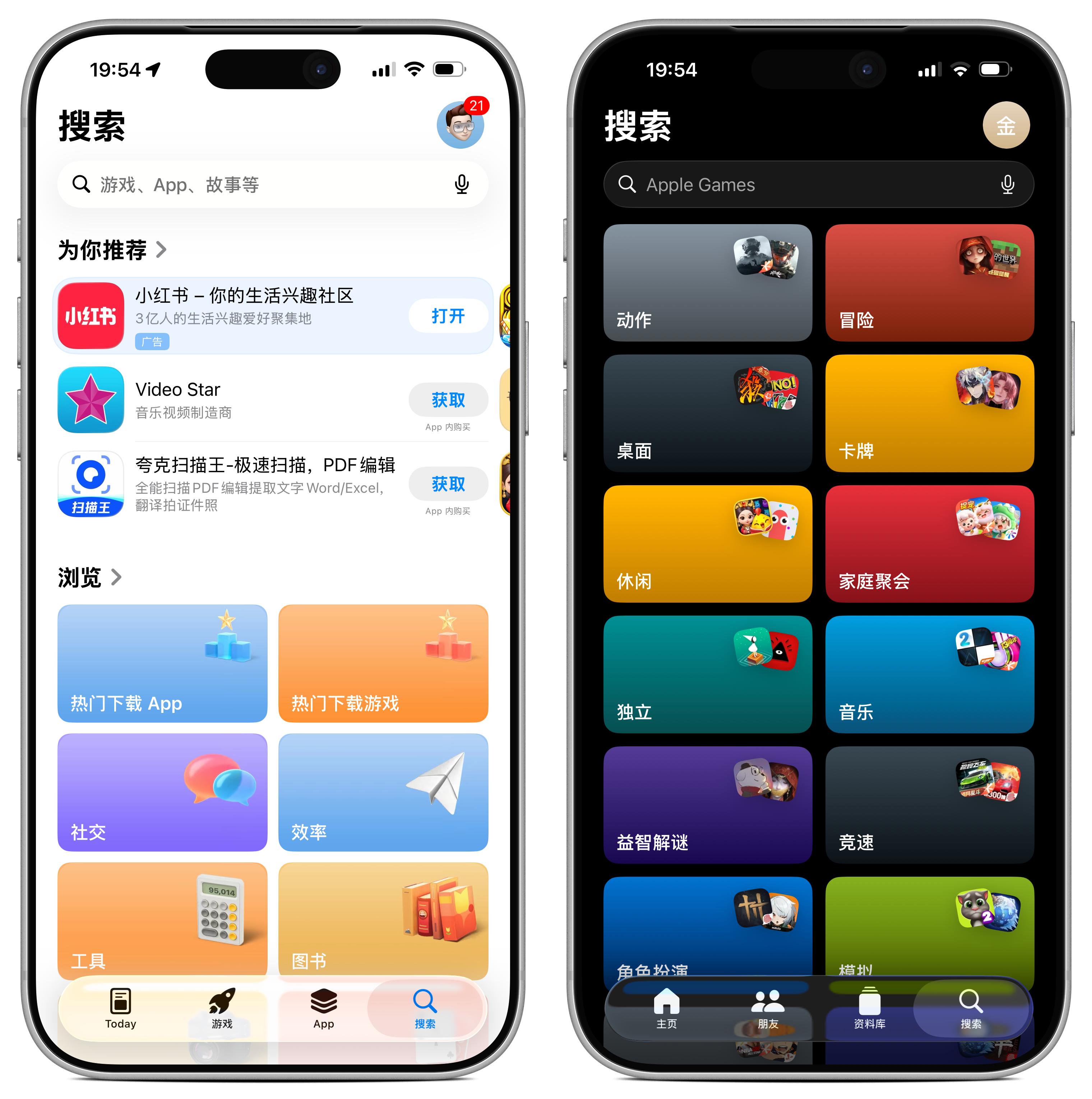 搜索按钮调整 在上一个测试版中,苹果已经对 App Store 搜索入口进行过一次调整:底部独立搜索被取消,搜索框回归顶部。而在 Beta 2 中,游戏 App 也同步采用了这一设计。